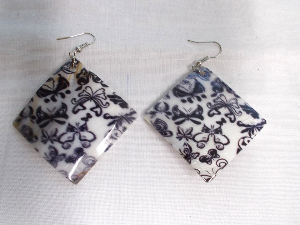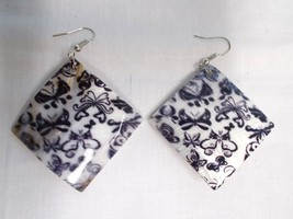 NEW ELEGANT BLACK BLURRED BUTTERFLY / BUTTERLIES PRINT MOP SHELL SQUARE EARRINGS