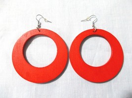 LARGE SIZE WOOD TRUE RED COLOR HAND PAINTED SATIN FINISH CIRCLE ROUNDS DANGLING EARRINGS - NOT TOO HEAVY....LIGHTWEIGHT