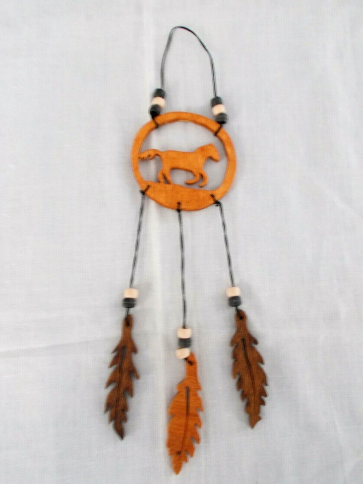 You are viewing a hand made / hand crafted ALL WOOD Dream Catcher with a WILDLIFE ANIMAL FULL BODY RUNNING HORSE / PONY cut out in the center and 3 dangling cut out wooden FEATHERS