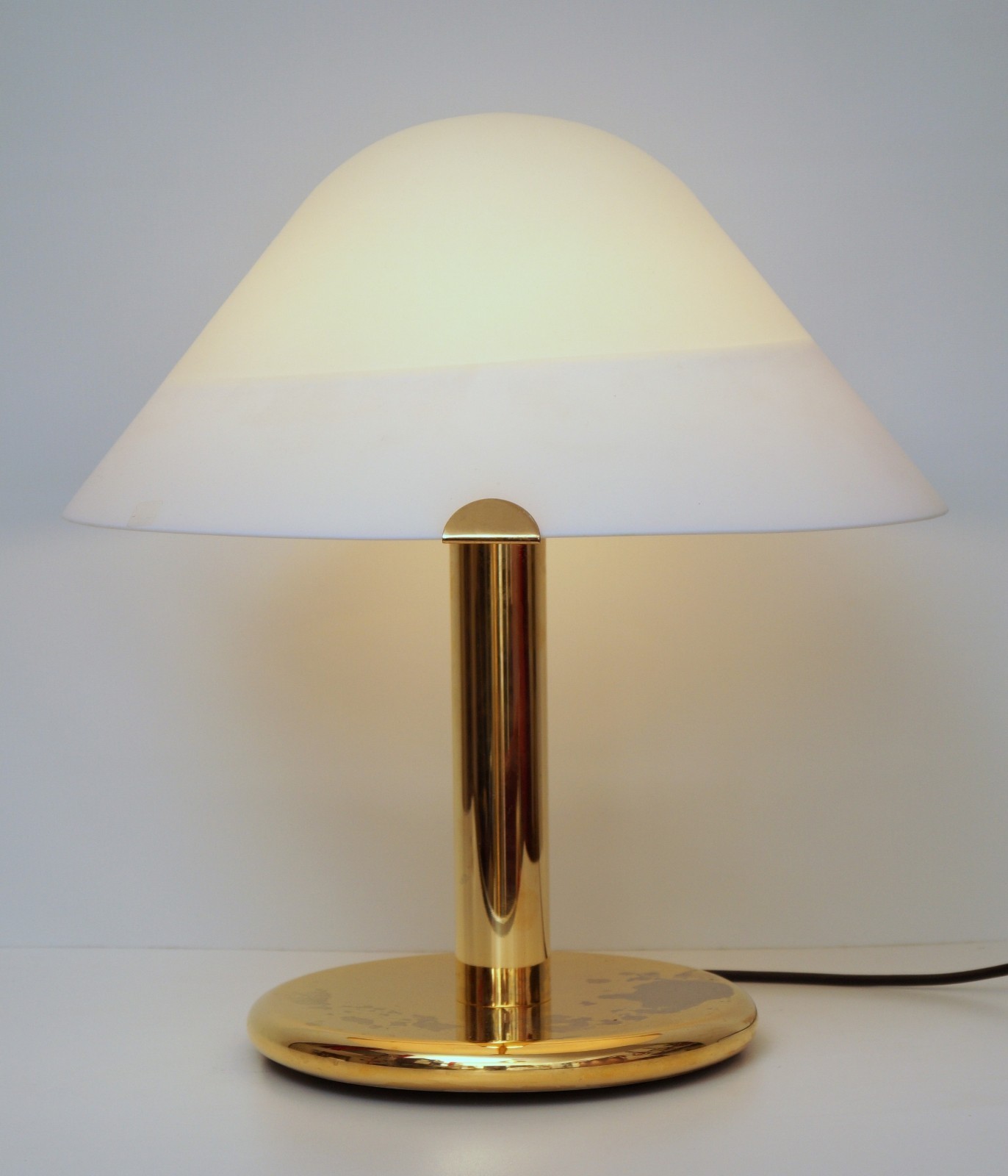 Lampe de table de design italienne classique. Engrenage de conception en laiton. Pots sur la plaque de base (voir des photos detaillees). Execution tres difficile. Murano Glass Shade. Hauteur totale d'env. 42,5 cm, diametre Schrim env. 40 cm. Installation electrique completement nouvelle. Ligne d'alimentation en PVC noir avec un interrupteur intermediaire de cordon. 1 Xe 27 Version standard, jusqu'a Max. 75 Watts - Nous recommandons de toute urgence les lampes LED. Des centaines de plus de feux de deco dans notre boutique! De petites pieces telles que les vis et les rondelles renouvelees. Veuillez noter: toutes nos lumieres ont ete diffusees bien avant 2005, sont dans leur etat d'origine et ne relevent donc pas de la loi sur les dispositifs electriques et electroniques (directive WEEE de l'UE). Vente sans decoration ni lampe! Expedition gratuitement en Allemagne!
