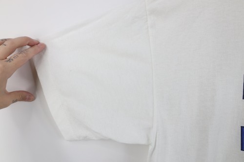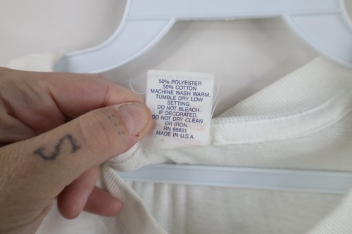 Stains left armpit. Collar, arms discolored. Yellowed. Sheer fabric. Graphics faded. Pilling. Made in USA