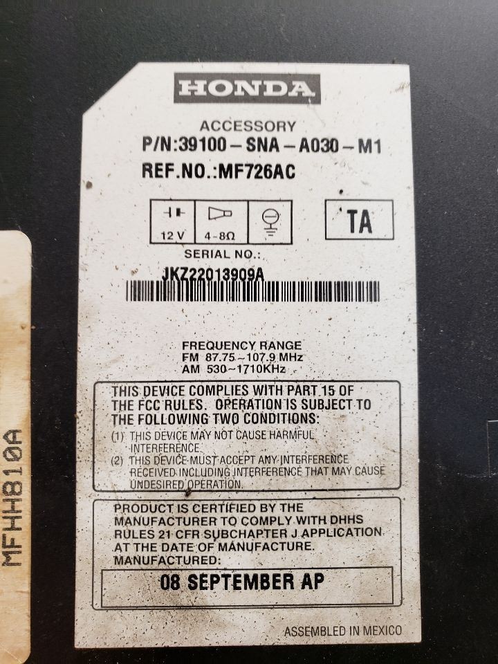 CIVIC 06-10 receiver (assembly), w/o navigation; Sdn, DX (AM-FM-CD-MP3), w/VP, face plate ID 2AJ0