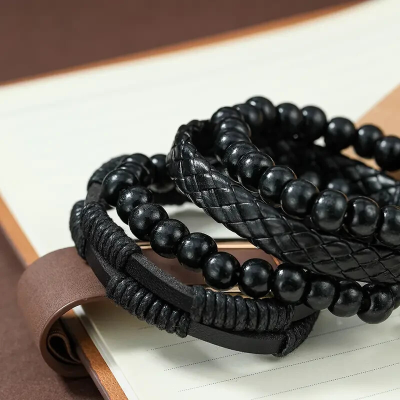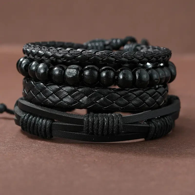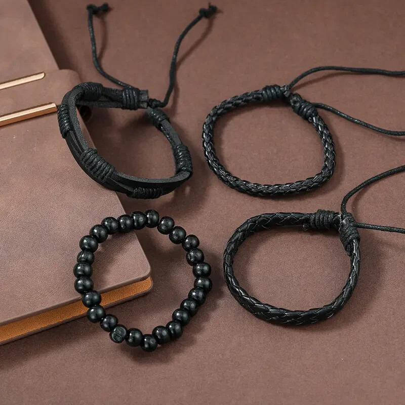 4pc Men's Vintage Leather Braided Handmade Bracelet ~Stretch, Drawstring Closure