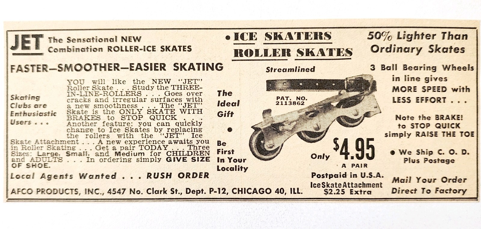 1947 Jet Ice Skates Rollers Skates Advertisement Vintage Sports Footwear E8K