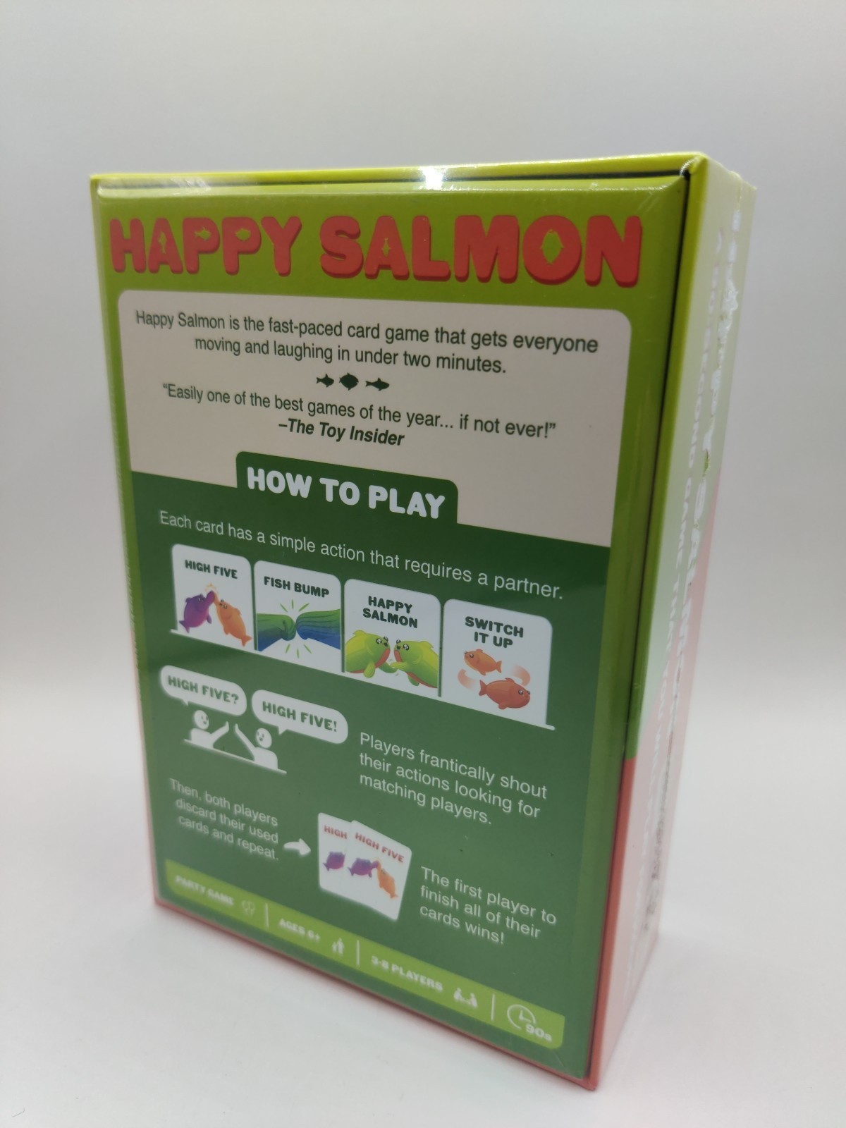 "Happy Salmon" is a fun and engaging card game perfect for family parties. With a minimum of 3 players and a maximum of 8 players, this game is suitable for ages 6 years old and older.