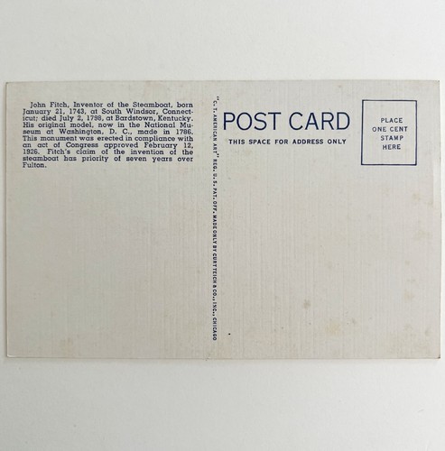 John Fitch Memorial Steamboat Kentucky Postcard 1930s-40 Bardstown PCBG11A