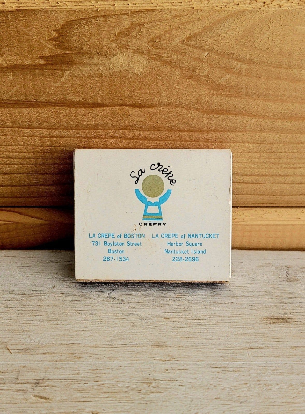 Antique Matches La Crepe Boston Massachusetts This crepe restaurant is no longer in existence. These are from approximately 1960-1970Still has a few matches and one broken one. Just a little under 2 inches wide ans approx 2 inches long. In good vintage condition with typical wear from use, age and storage B48
