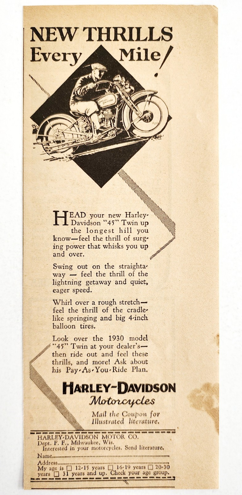 1929 Harley Davidson Motorcycle 45 Twin Advertisement 1930 Model Antique DWY10