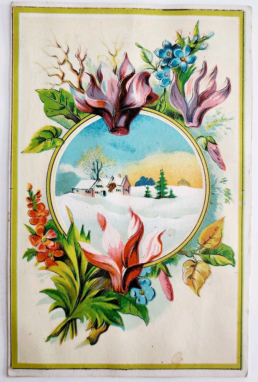 C1900s Victorian Trade Greeting Card Lithograph Easter Flower Winter Scene E98D
