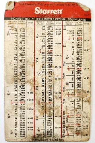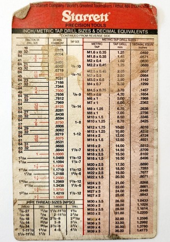 C1970s-80s Starrett Precision Tools Inch Metric Drill Sizes Decimal Card E88H