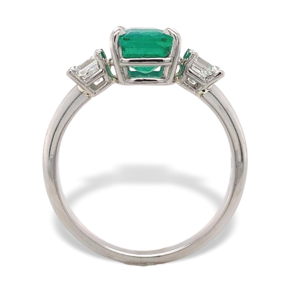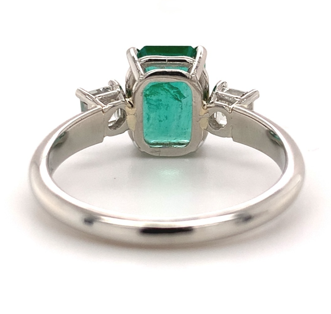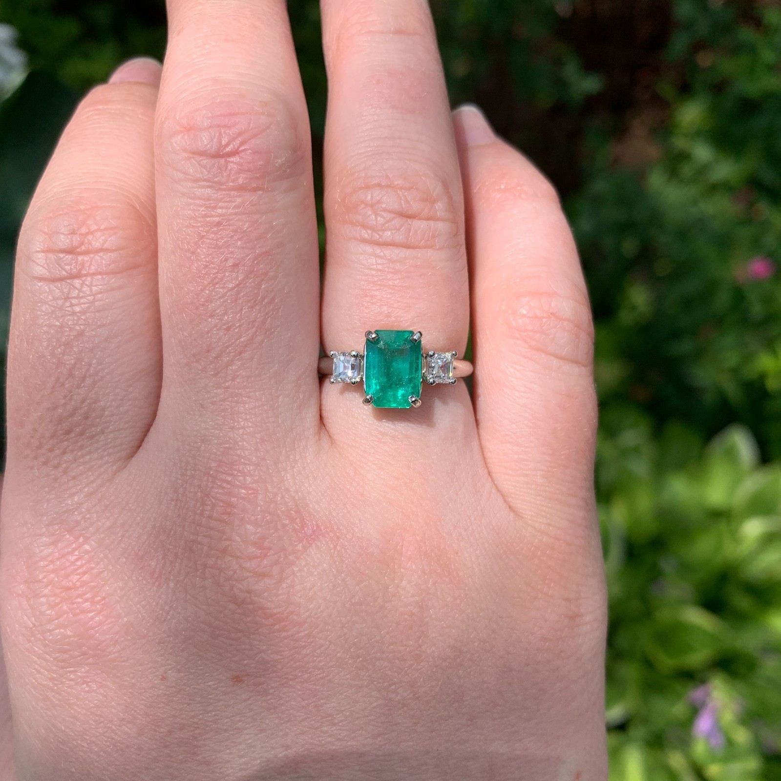 Platinum three-stone ring with a natural emerald cut emerald and two asscher cut diamonds. The genuine earth mined emerald has GIA report #5231536980. The emerald measures 8.91mm x 6.36mm and weighs 1.86 carats. There are two genuine earth mined diamonds measuring about 3.5mm and weighing .58cts total. The diamonds have VS2-SI1 clarity and G-H color.