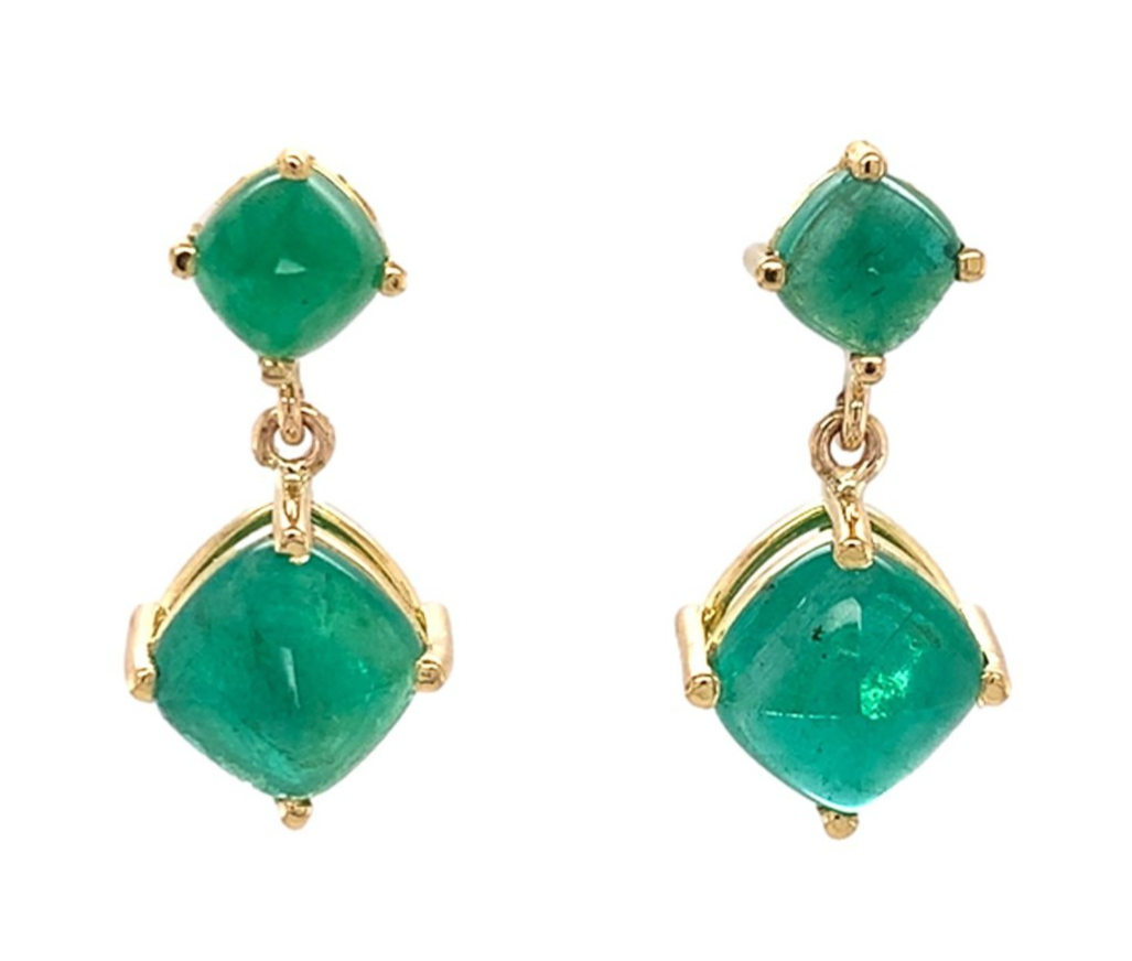 A pair of 18k yellow gold emerald drop earrings. The earrings have a total of 5.53 carats of earth mined genuine emeralds. The emeralds are a cushion cabochon with a point called a sugarloaf cut. The larger emeralds measure about 7mm, and the smaller are about 5mm. The earrings measure 3/4" long with post and 14k yellow gold clutch backs. The pair weighs 2.43 dwt., and are new. Exceptional!