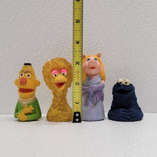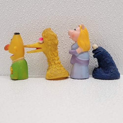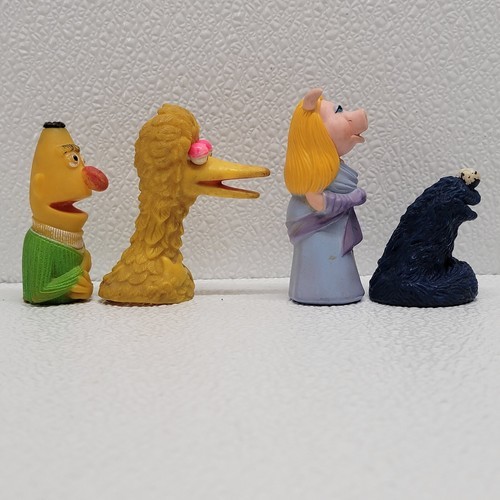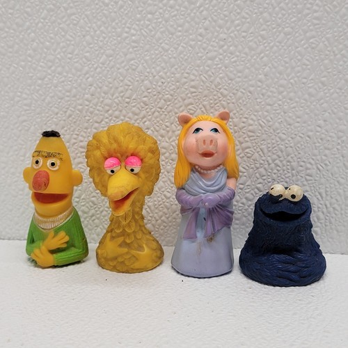 Vintage 1970's Sesame Street Finger Puppets Lot of 4 - Big Bird, Bert, Miss Piggy, Cookie Monster. Some wear and marks from play/age - see images for condition. Images show actual toys that will ship.