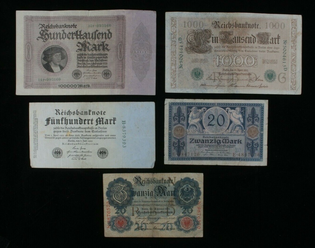 1910-1923 ALLEMAGNE 5-Notes Set // 20 Marque a 100 000 Marque // Empire Weimar
