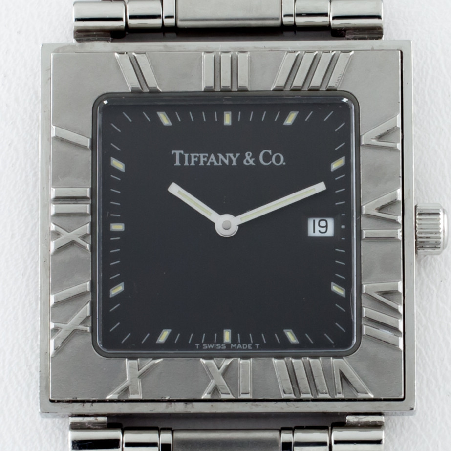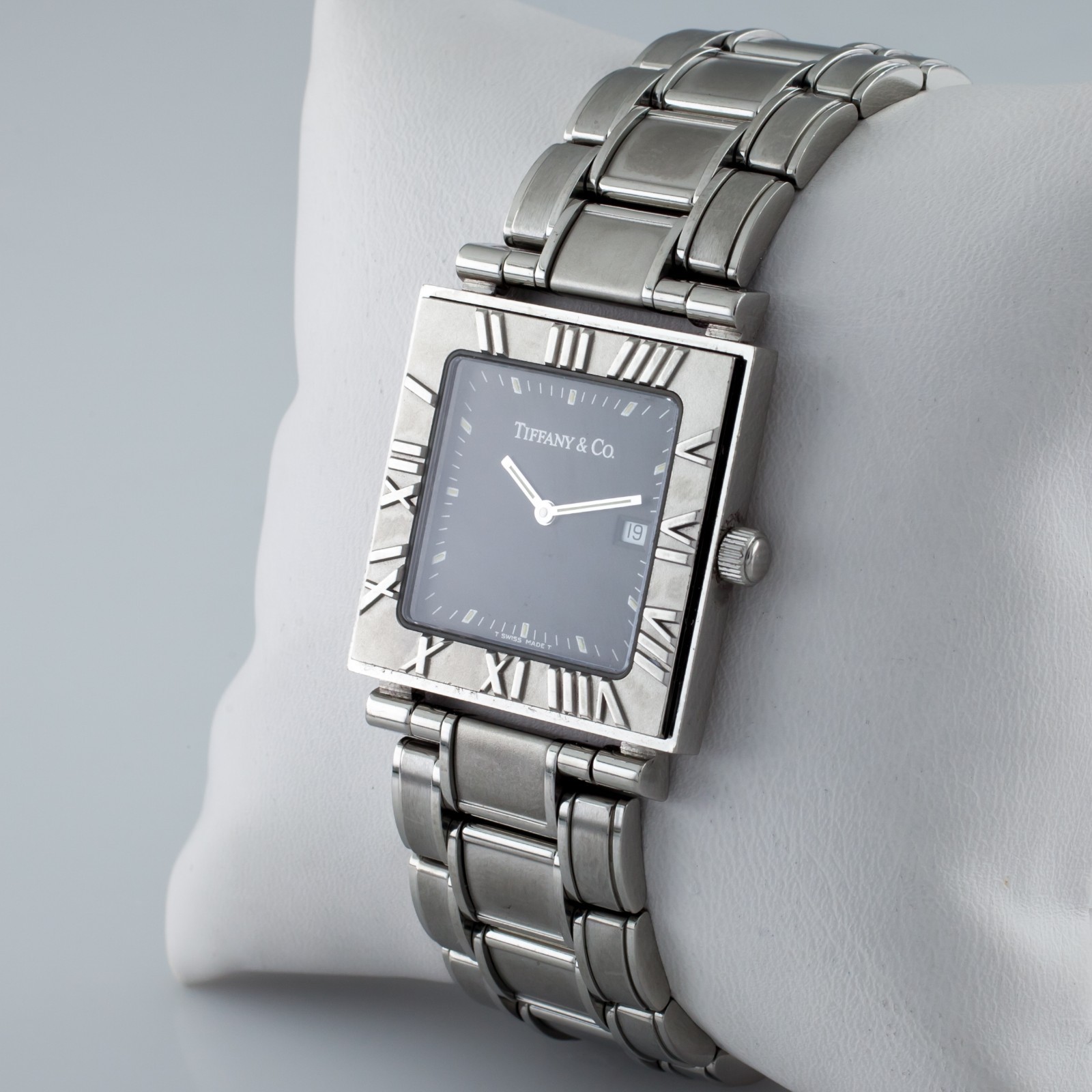 Tiffany Co. Montre carree a quartz Atlas en acier inoxydable avec date
