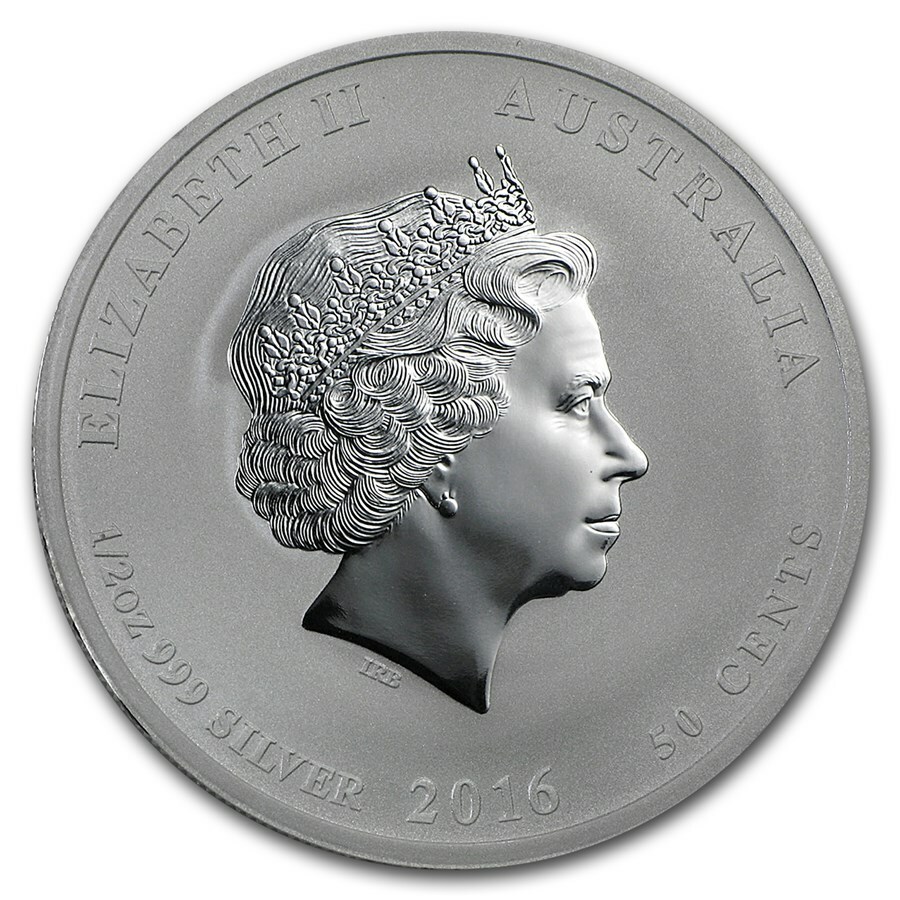 Reverse presenta un perfil de Queen Elizabeth II con la inscripcion "Elizabeth II / Australia / 1/2OZ 999 Silver / 2016 /50 Cents"