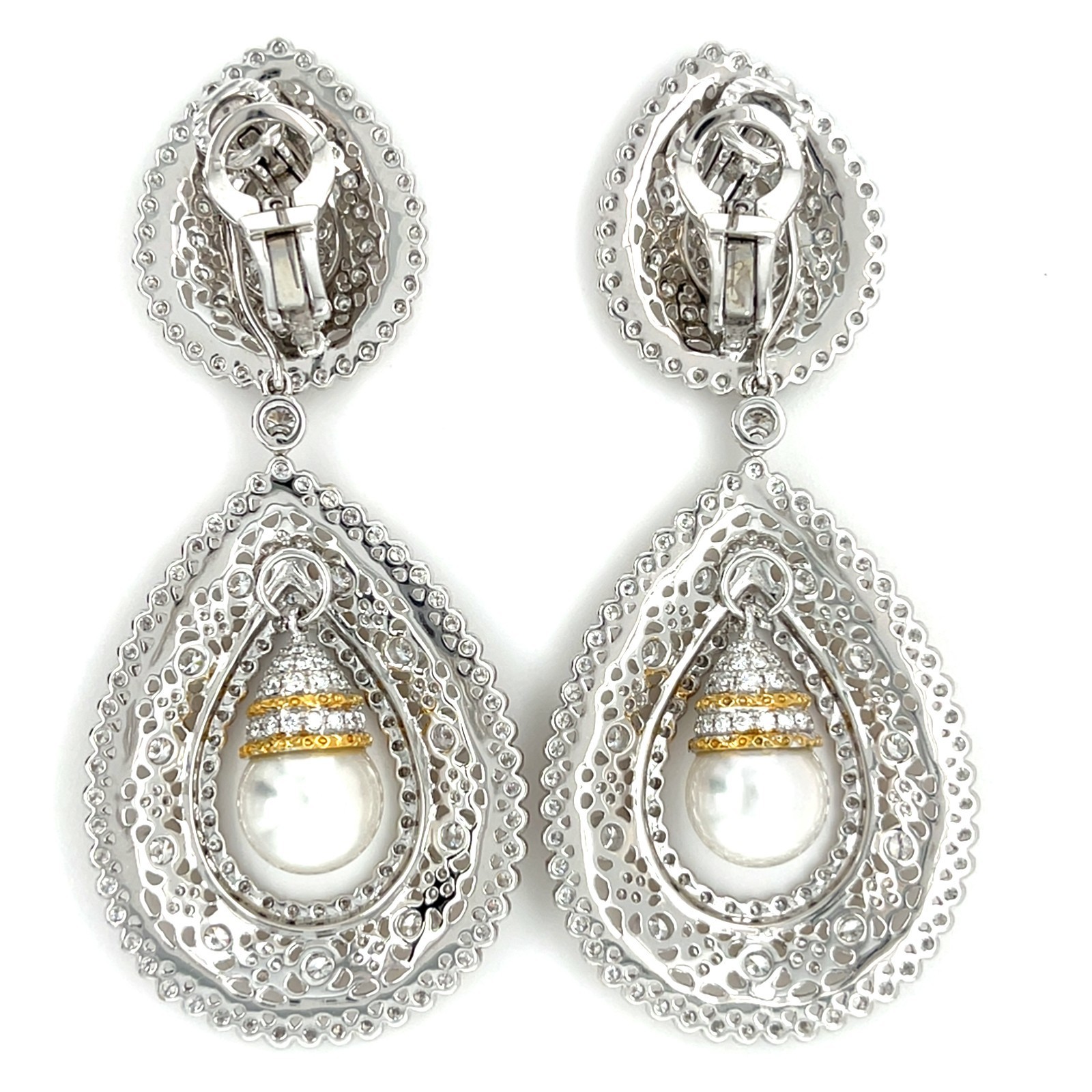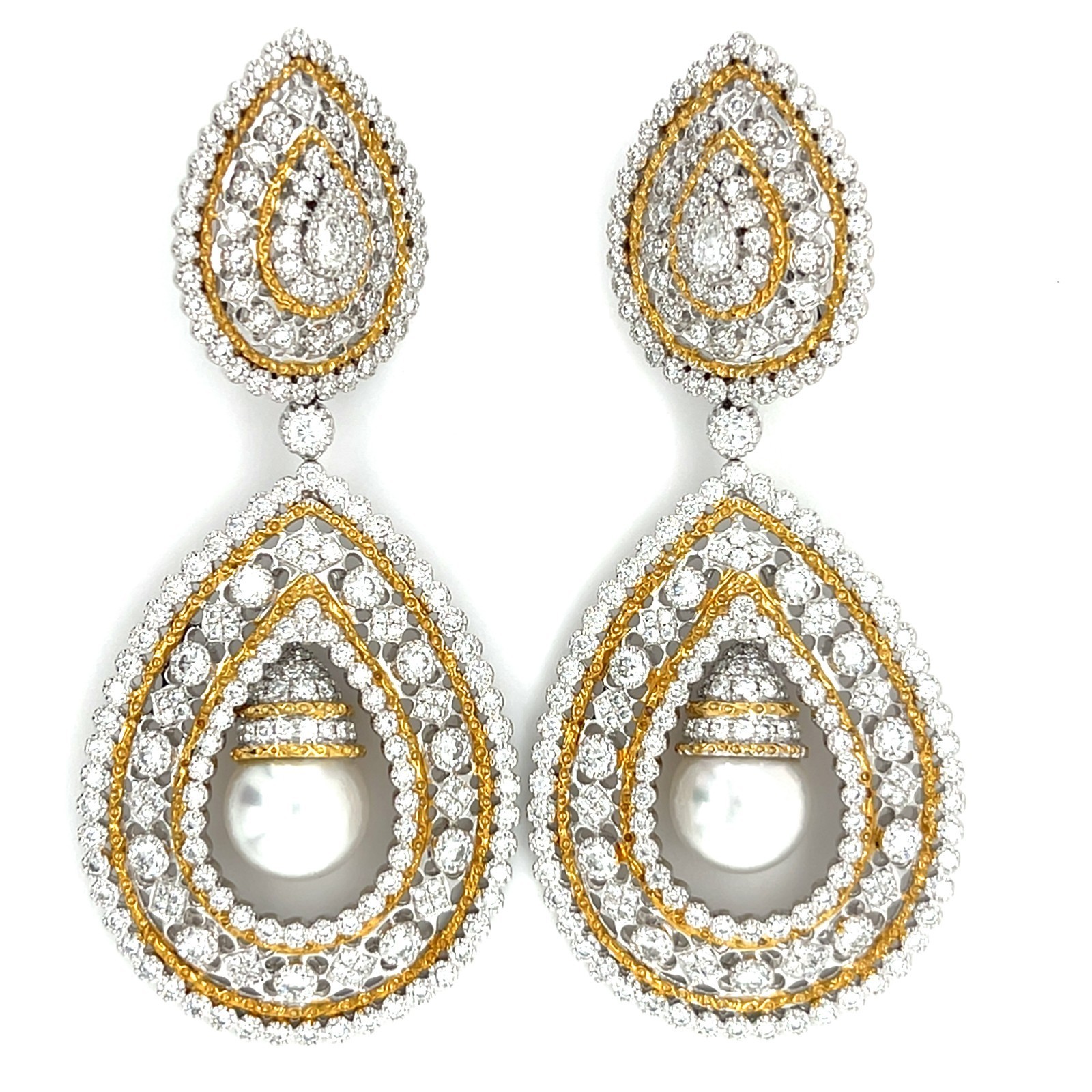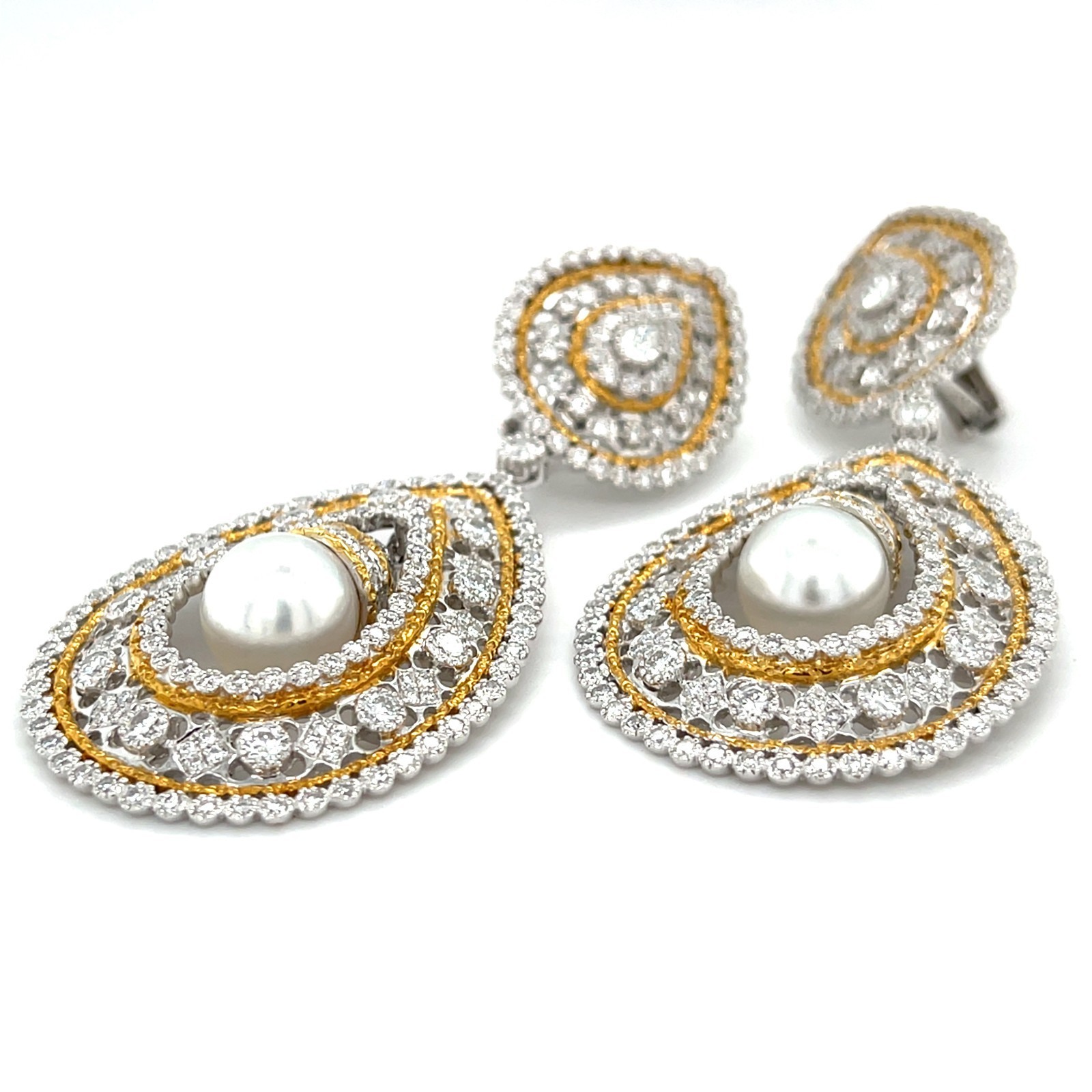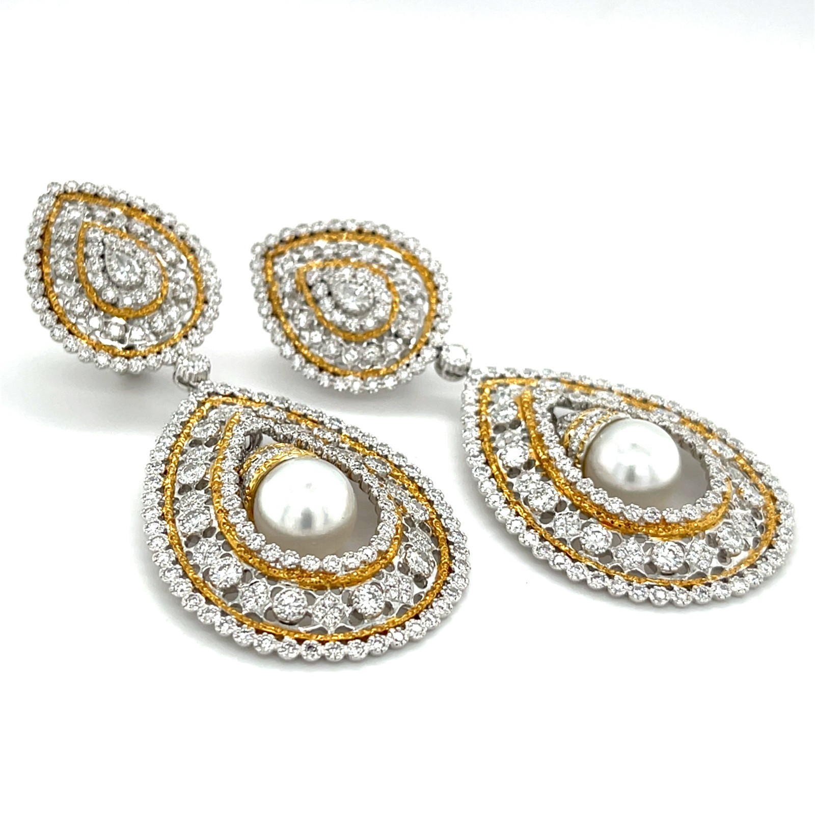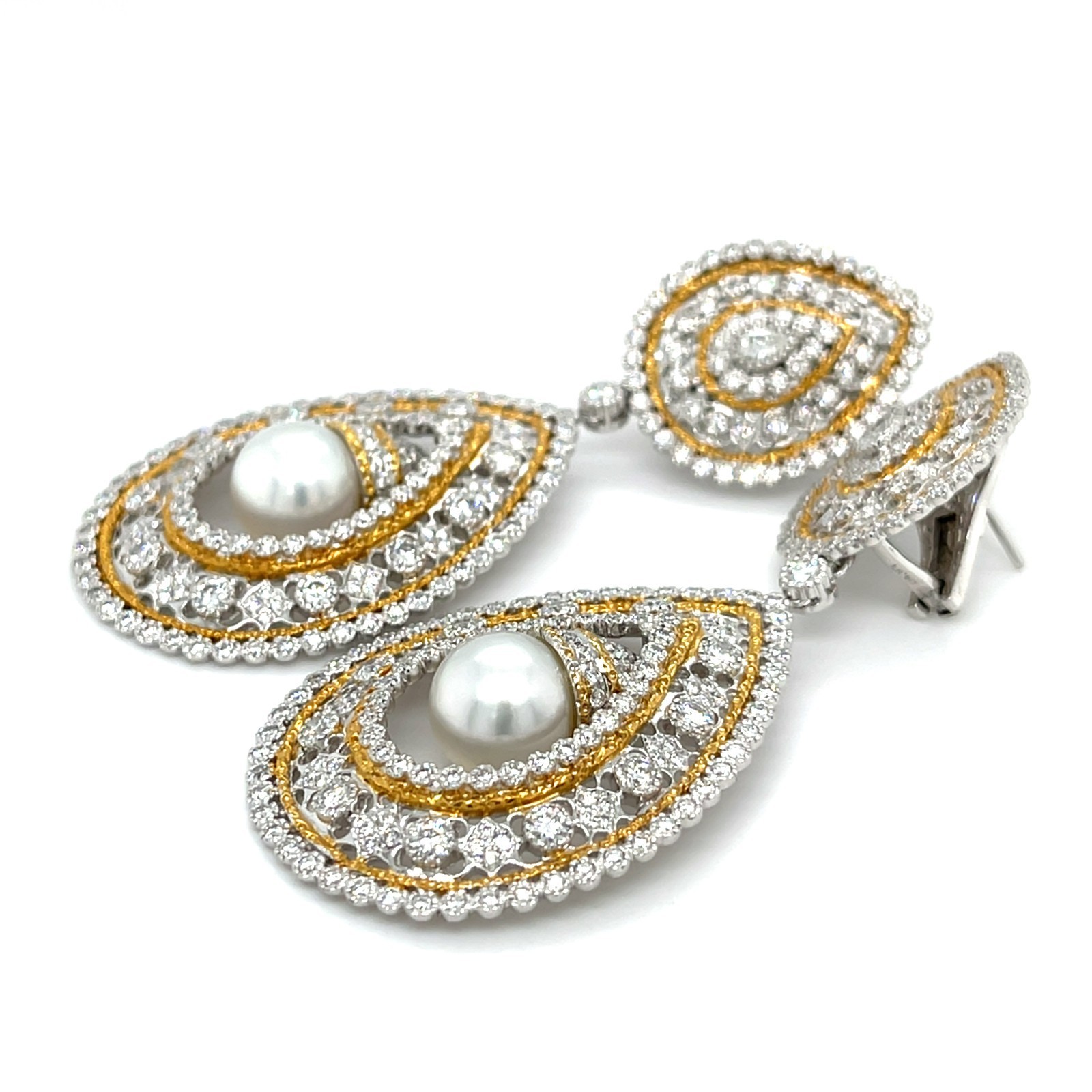 18k Bicolore Oro Pacifico Mare Coltivate Perle 2.25ct Diamante Goccia Orecchini