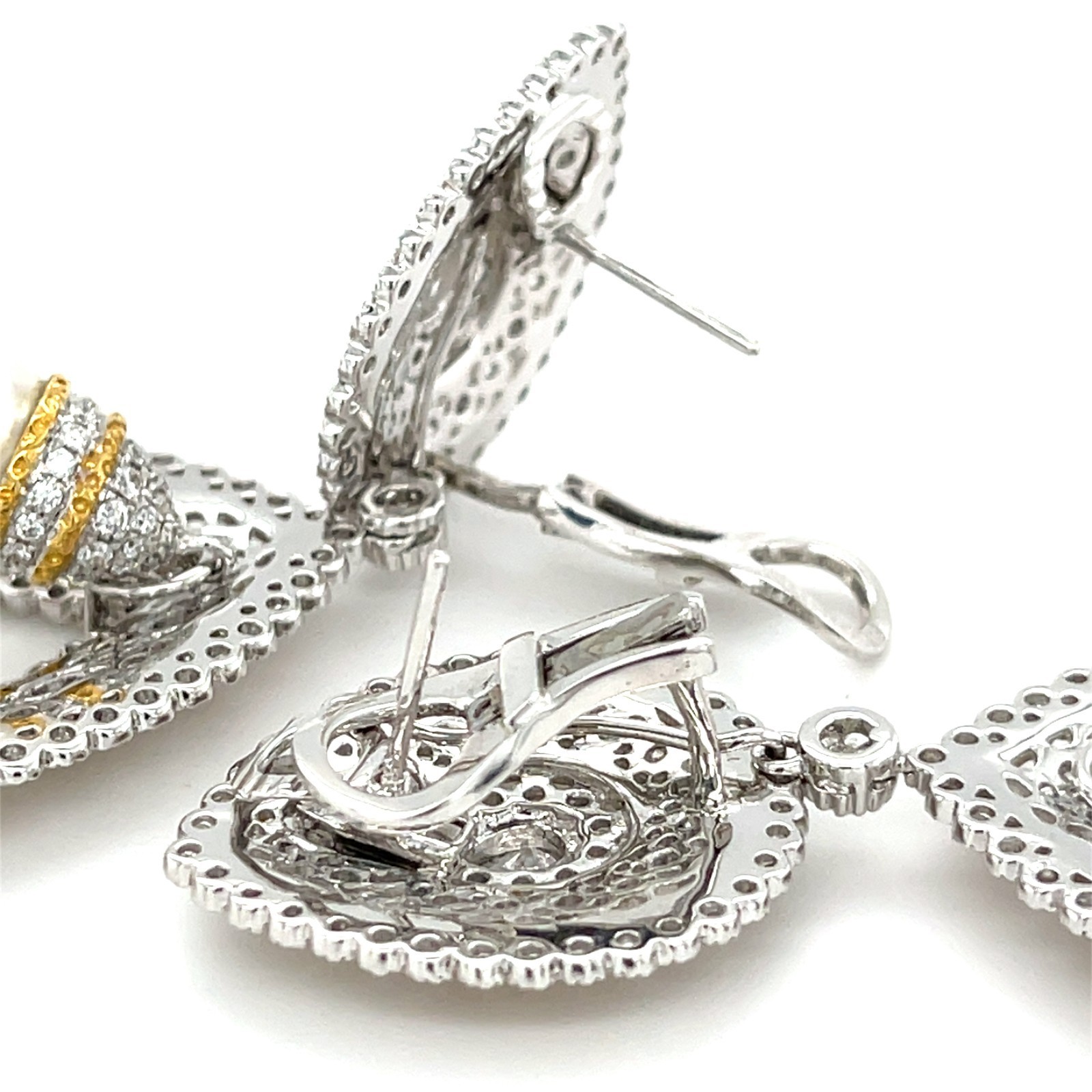 Condizione generale: molto buono. Una coppia trasformativa di orecchini contrassegnata 750 su schienali di clip, testa oro 18K. Completato da un pali incernierato e pieghevole e back clip.