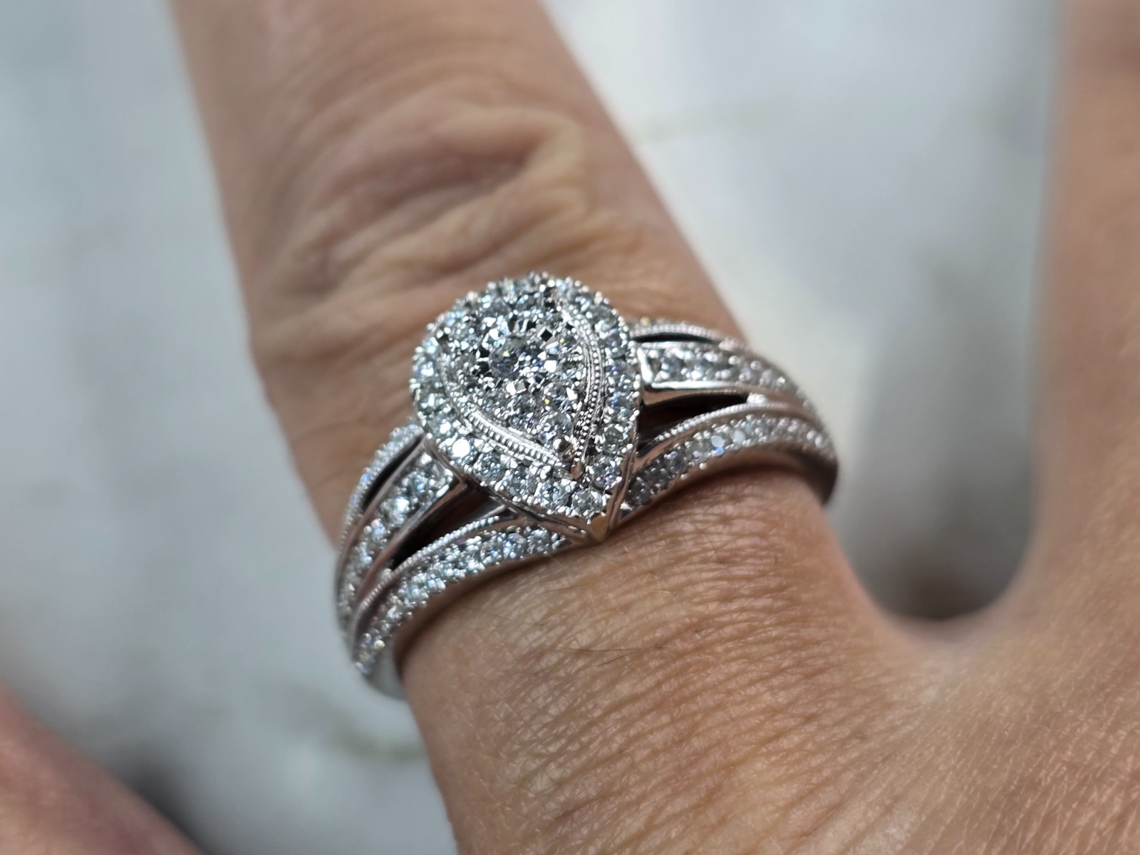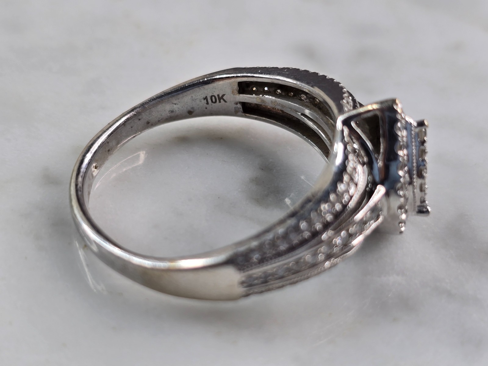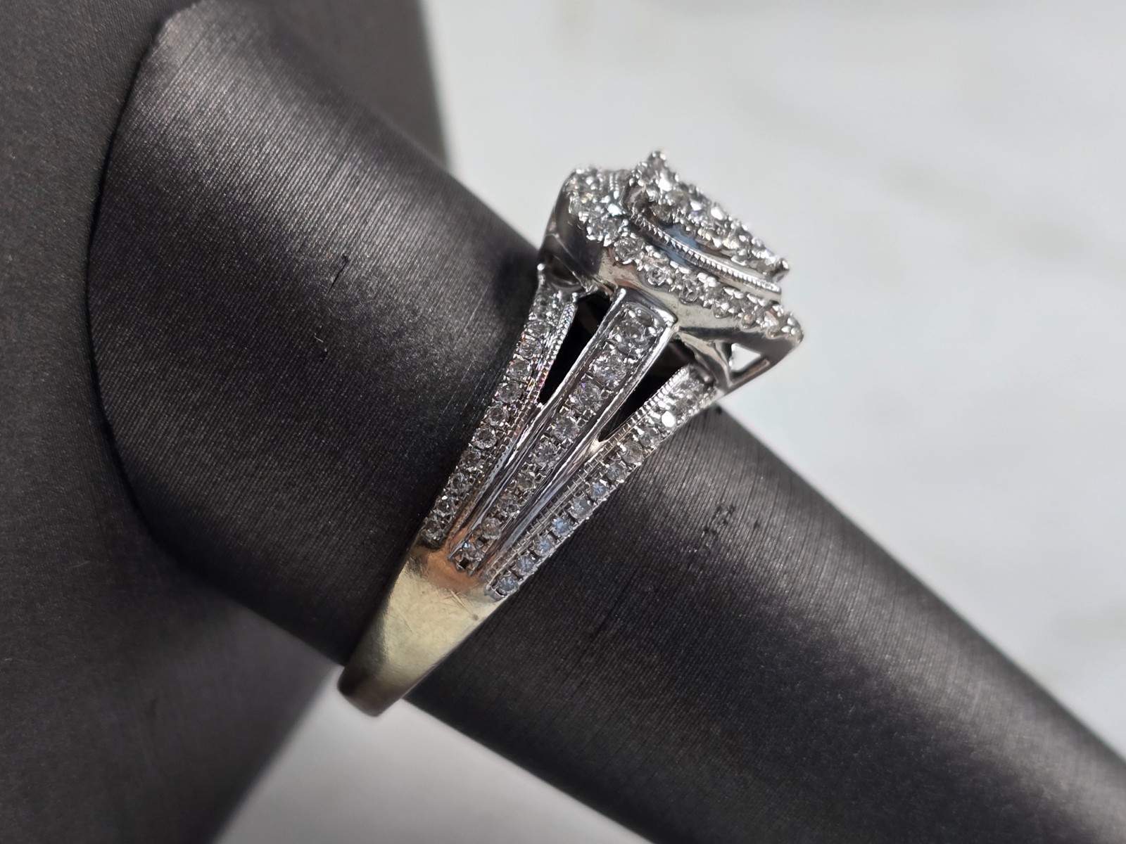 A WOMENS VINTAGE 10K WHITE GOLD DIAMOND ENGAGEMENT WEDDING RING. THERE ARE ABOUT 1.0cts OF DIAMONDS IN THIS RING. THE TOTAL WEIGHT IS 5.5g, AND IS A SIZE 10.25. THE LENGTH OF THE RING IS 1/2". ANY QUESTIONS PLEASE DONT HESITATE TO ASK. BE SURE TO CHECK OUT SOME OF OUR OTHER GREAT ITEMS UP FOR SALE. THANK YOU.