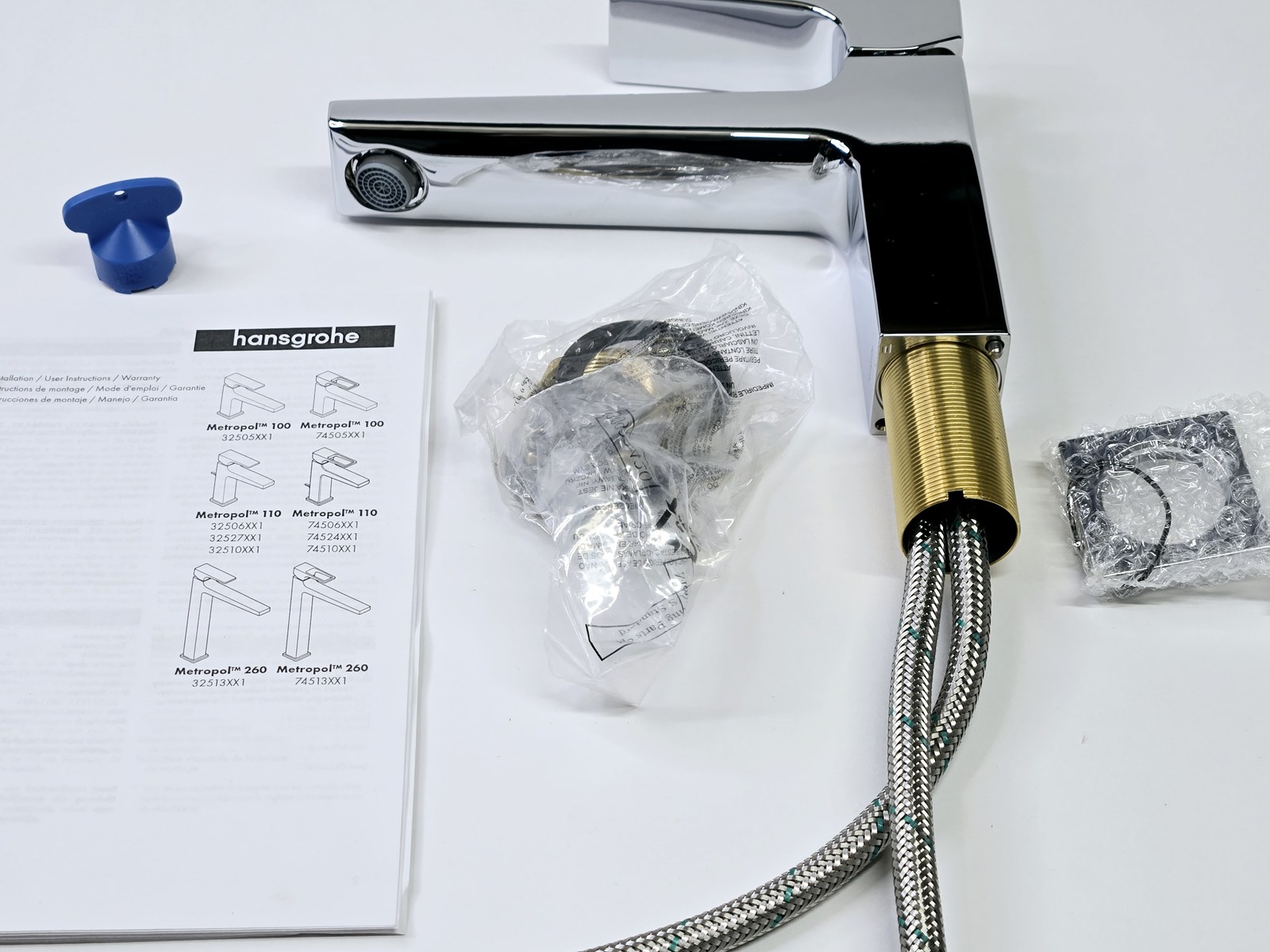 Box contents: single lever bathroom faucet, connection hoses, shaft attachment, mounting key, assembly instructions