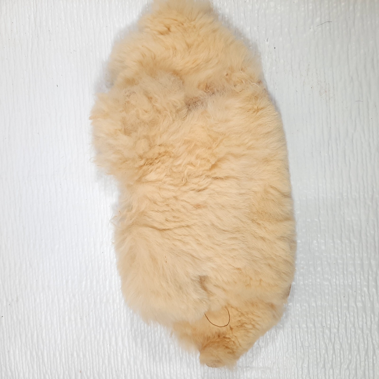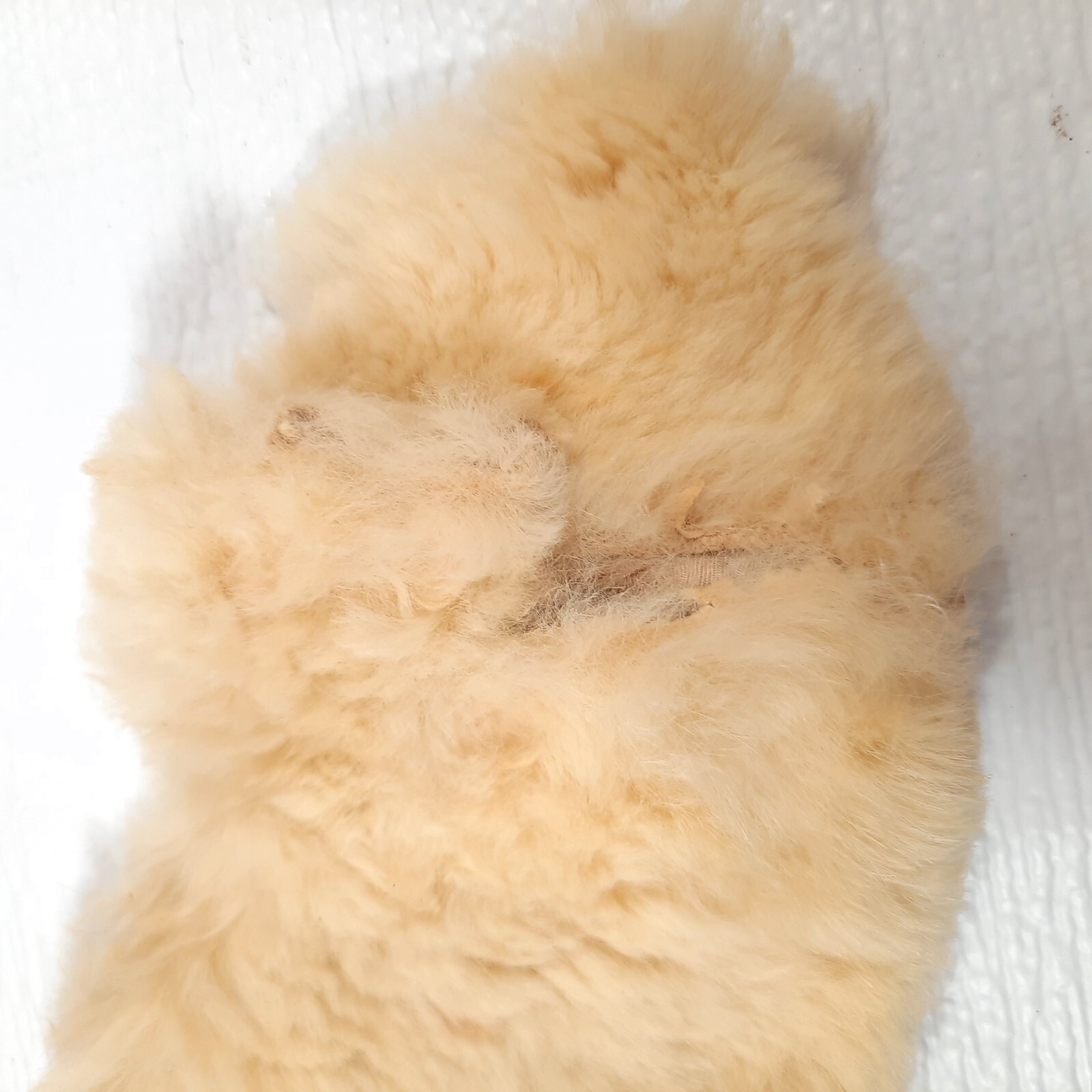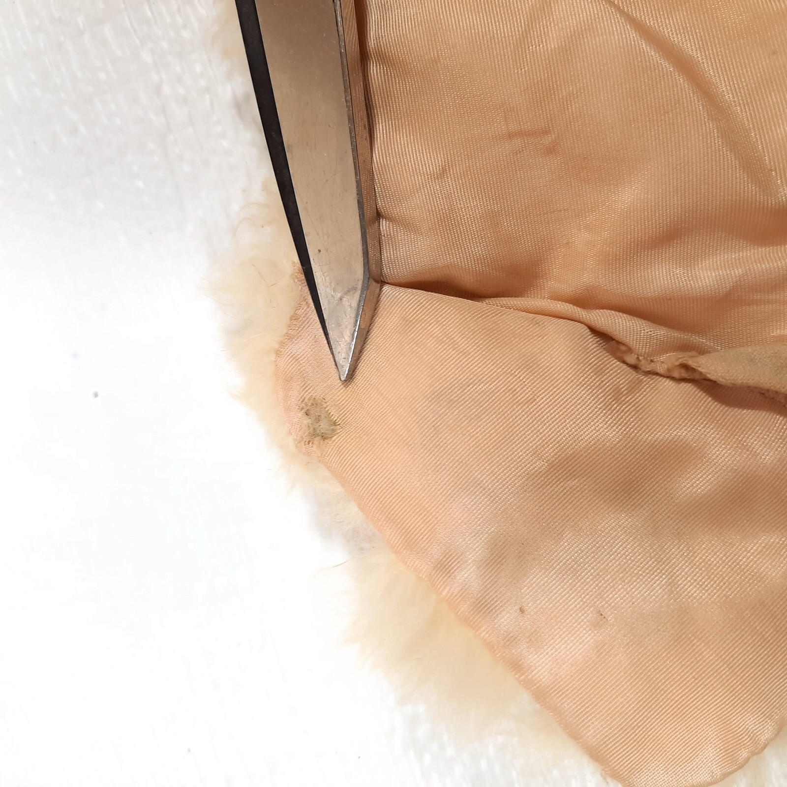 Off white color. This may be real fur(possibly rabbit.) Side seam has come undone and small hole near the top lapel, as shown. Some staining/discoloration inside. See pics.