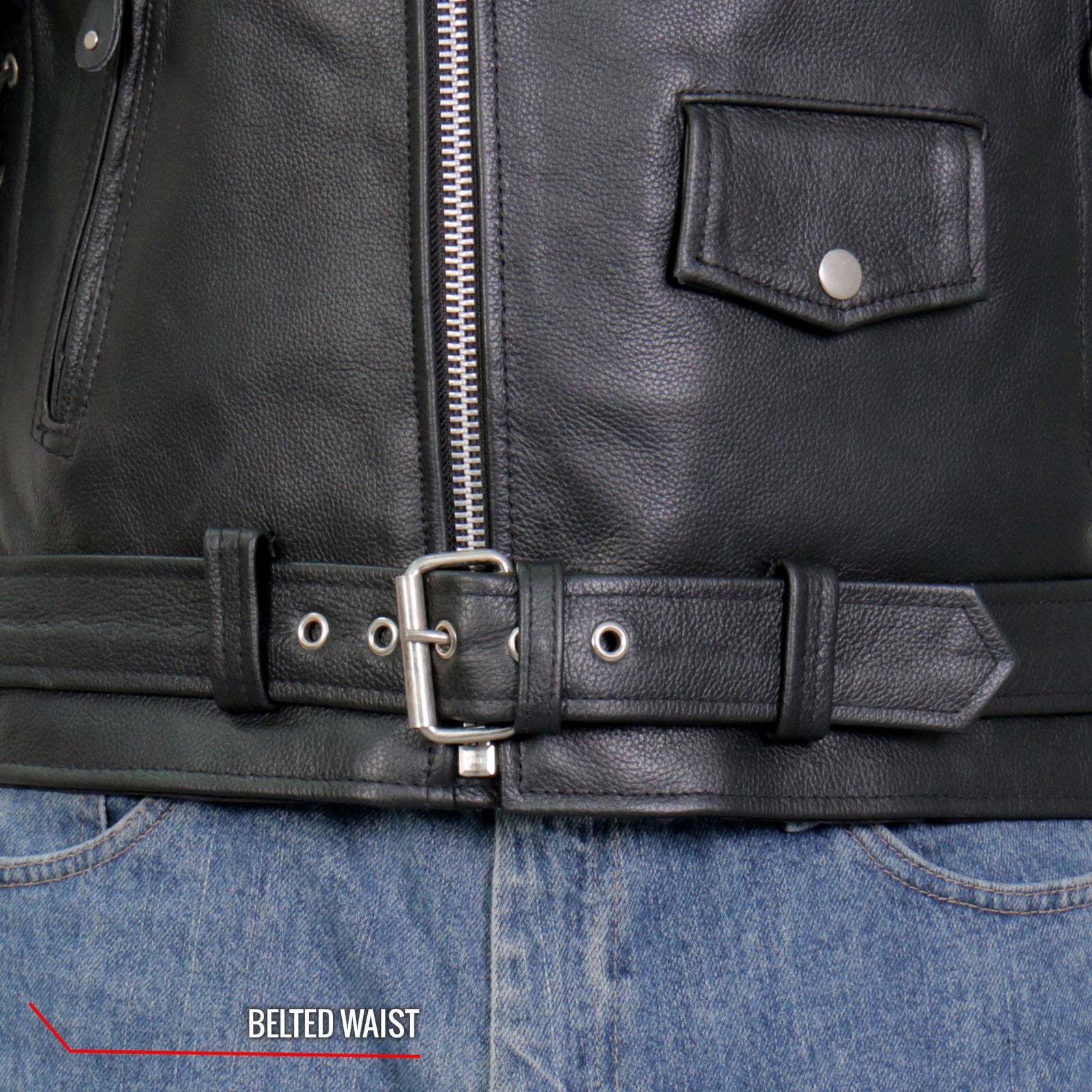 Men's classic style jacket in a comfortable top grain leather. This jacket includes three outside zipper pockets, side lace, epaulets, and zipper cuffs. A half belt and silver hardware including belt buckle, snaps, loops, zippers and cowhide side lace add to the classic look of this leather jacket. This jacket does not come with leather zipper pull extensions. All our leather is handcrafted!