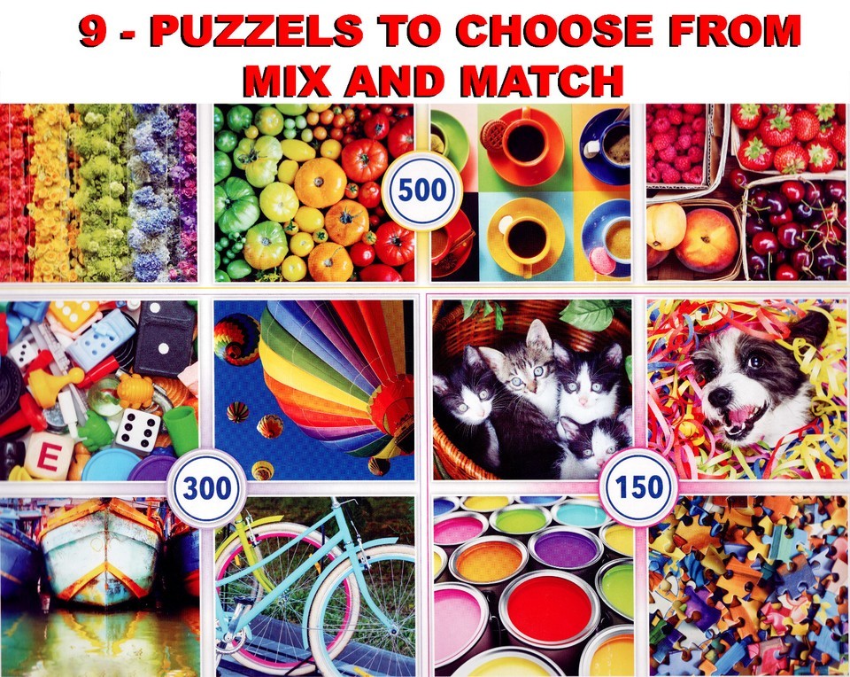 9 DIFFERENT JIGSAW PUZZLES 150-to-500 PIECE GAMES CAT DOG FRUIT BALLOONS BOATS
