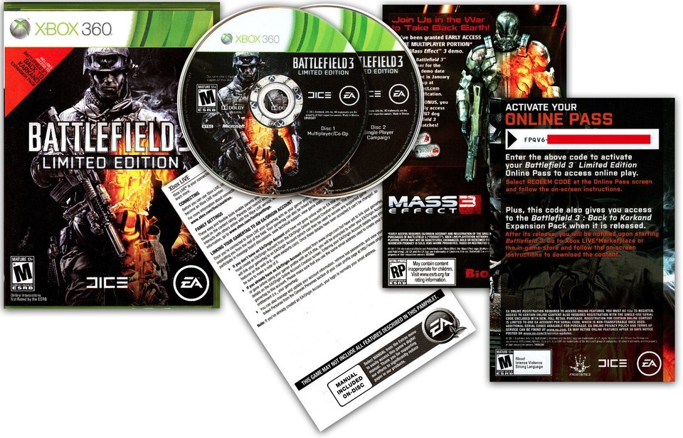 BATTLEFIELD 3 MINT 2 DISK XBOX 360 LIMITED EDITION GAME CASE MANUAL ONLINE PASS