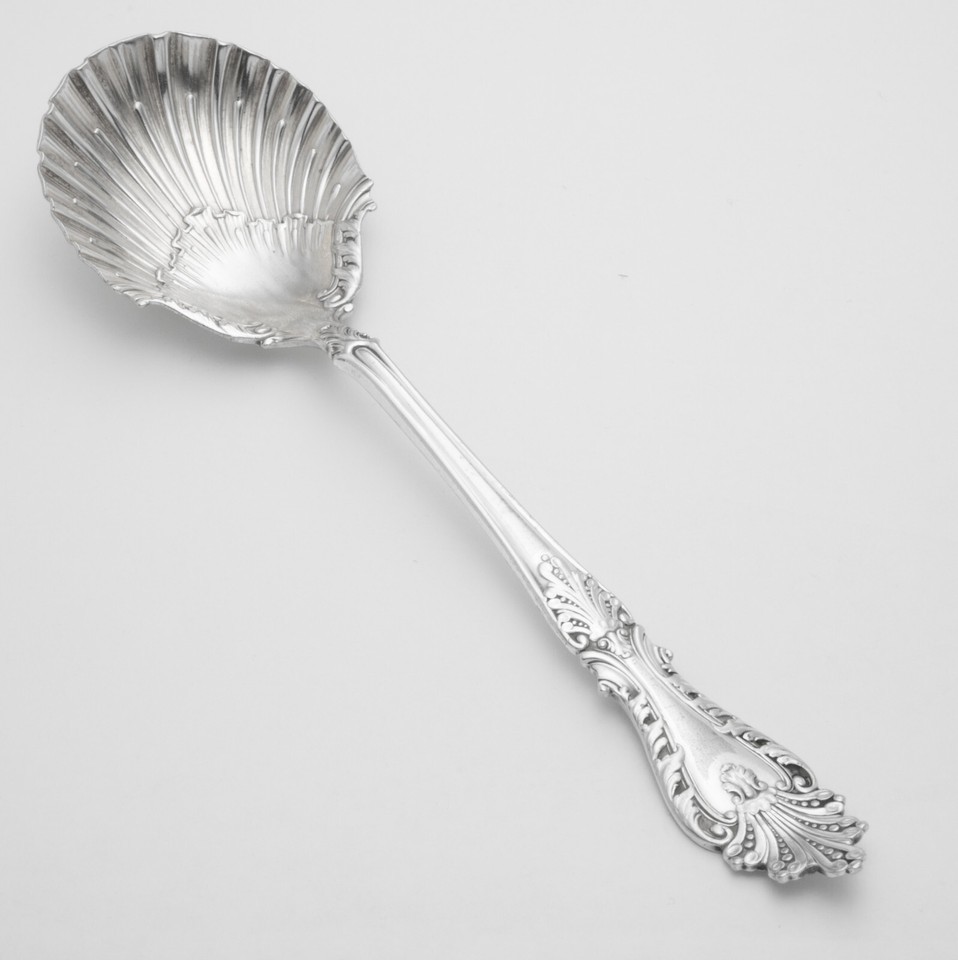Description: Shell Bowl, Gravy/Sugar Spoon, Silverplate, no monogram, Rococo design.