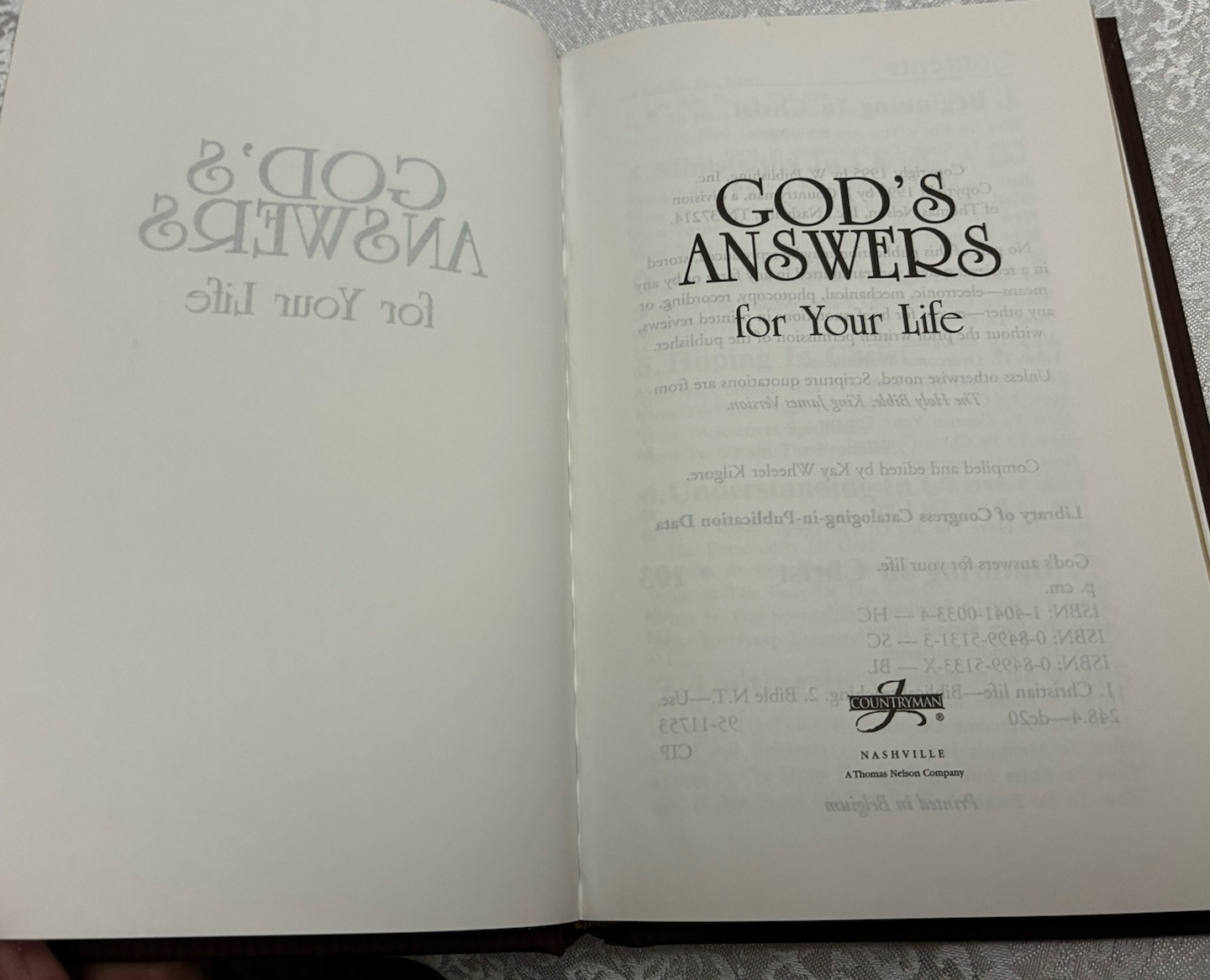 The product is a hardcover book titled "God's Answers for Your Life" by Thomas Nelson Publishers. Published by Nelson Incorporated, Thomas in 2003, this 304-page book offers answers for Christian life, inspirational messages, and biblical studies. Written in English by authors Countryman and Thomas Nelson Publishing Staff, the book aims to provide guidance and support for readers seeking spiritual enlightenment and wisdom.