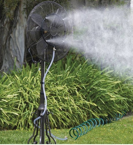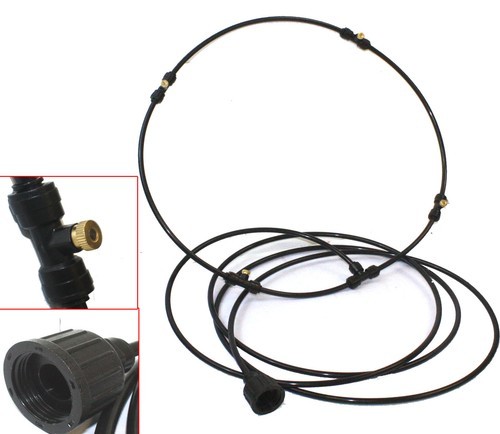 Outdoor Fan Misting Kit is sure to keep your guests cool and comfortable while they mingle at your next party. Attaching to garden hose or Use it with the submersible water pump taking water from pool or bucket of ice water.
