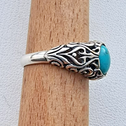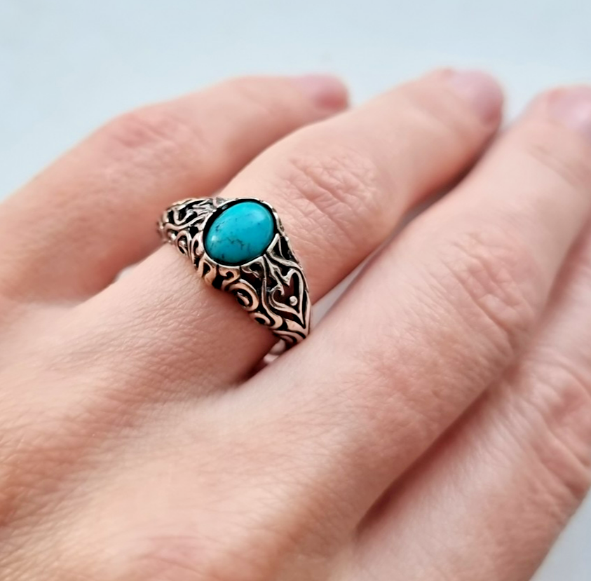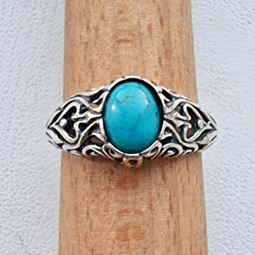 SOUTHWESTERN 925 STERLING SILVER OVAL 8x6 mm.TURQUOISE SCROLL SWIRL RING SIZE 8