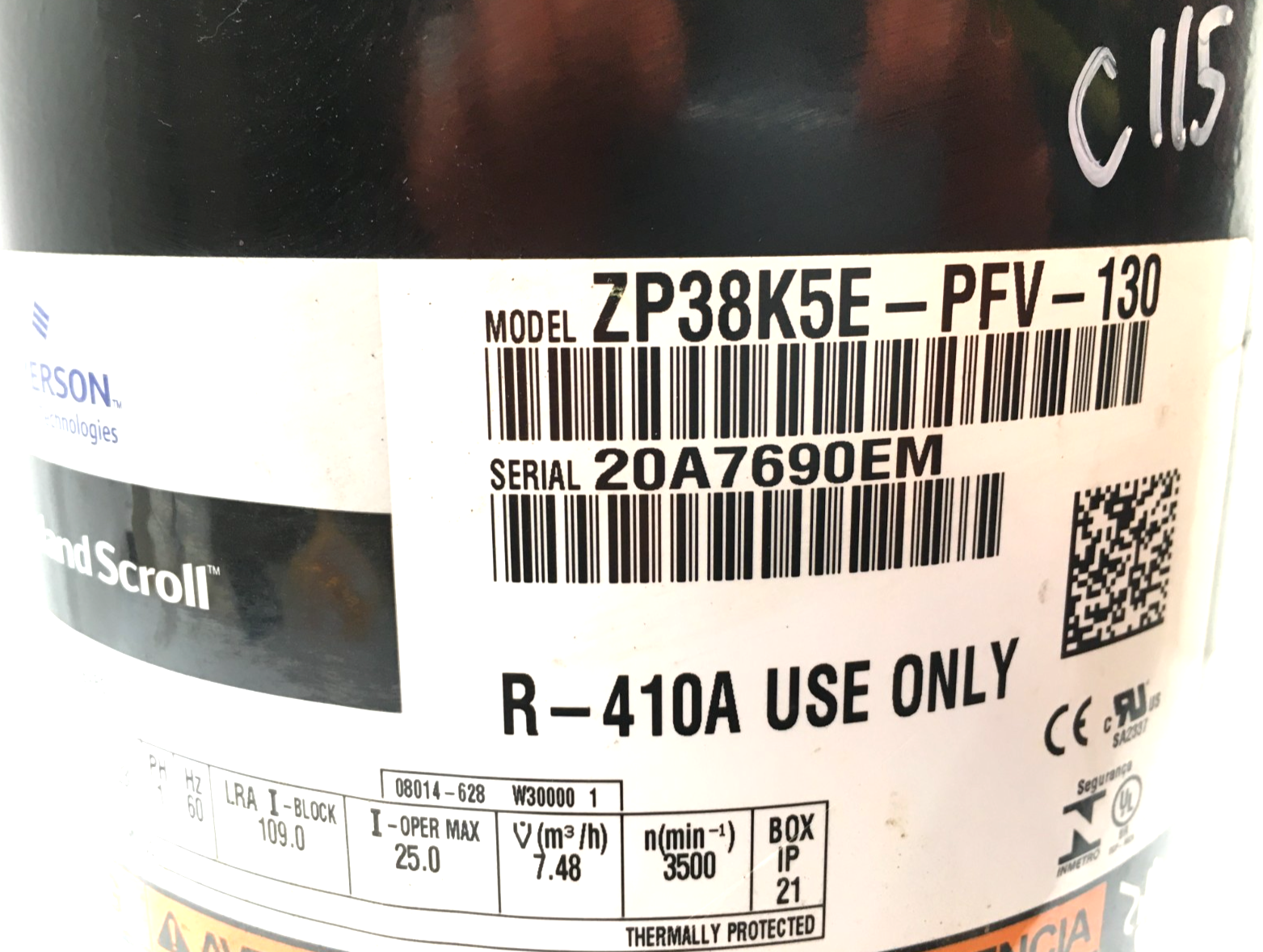 This is COPELAND Scroll ZP38K5E-PFV-130 230V 1PH 60HZ R-410A only! used part.