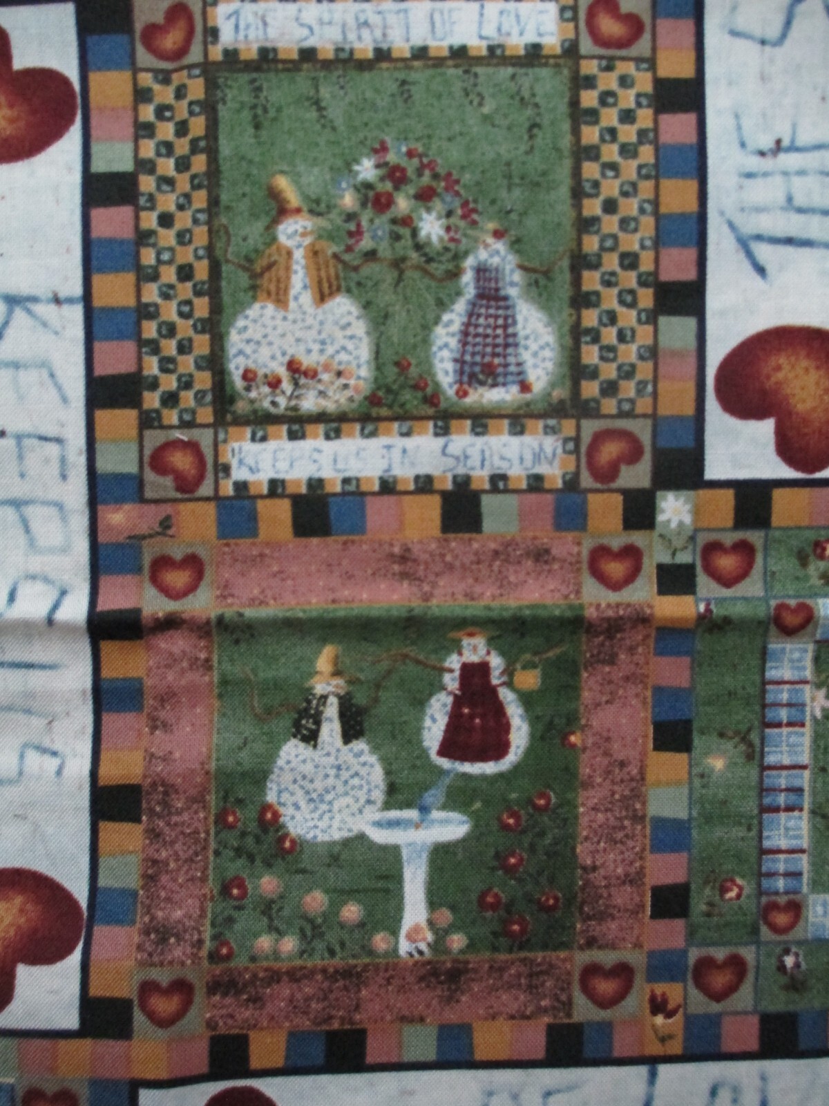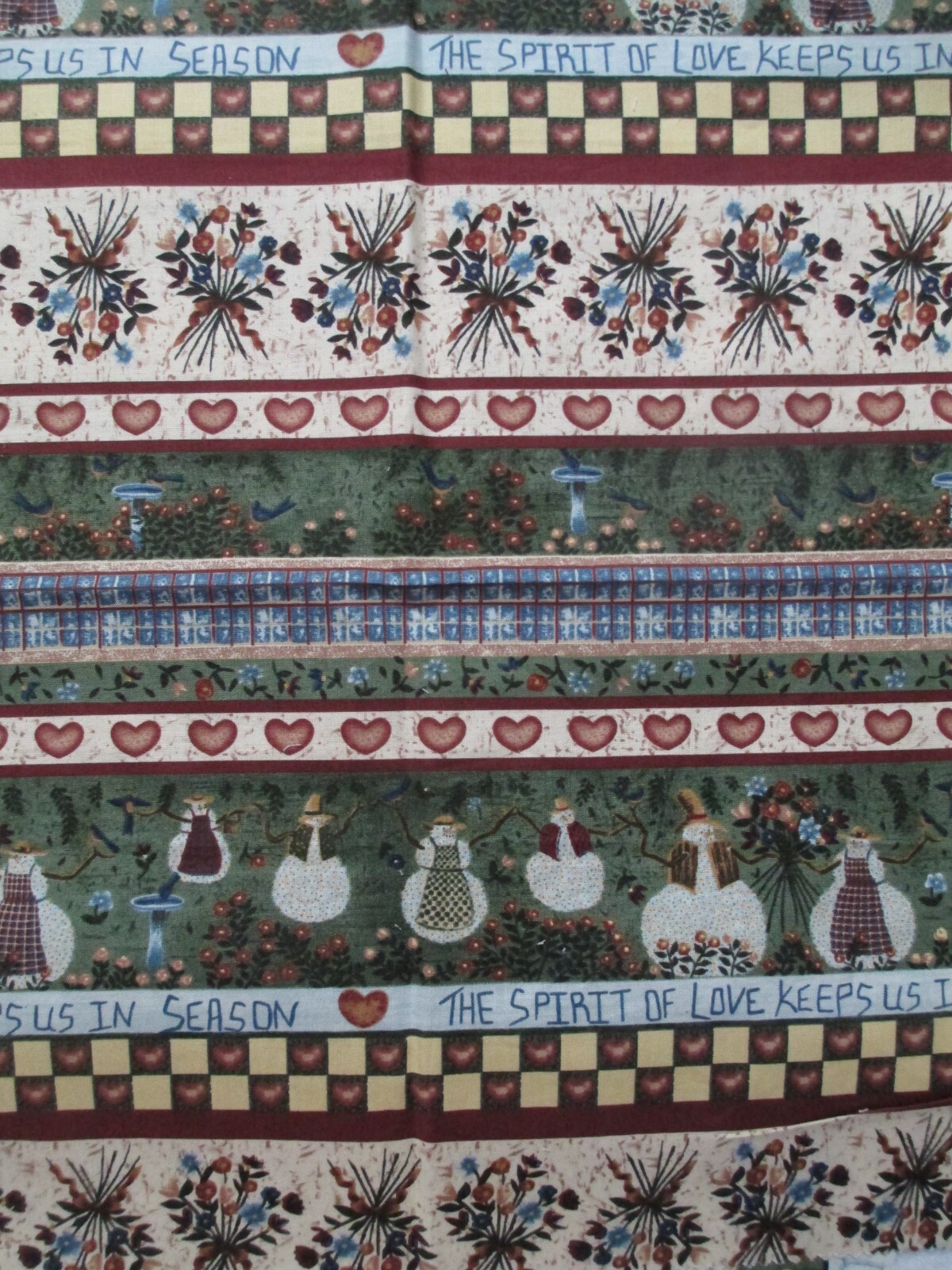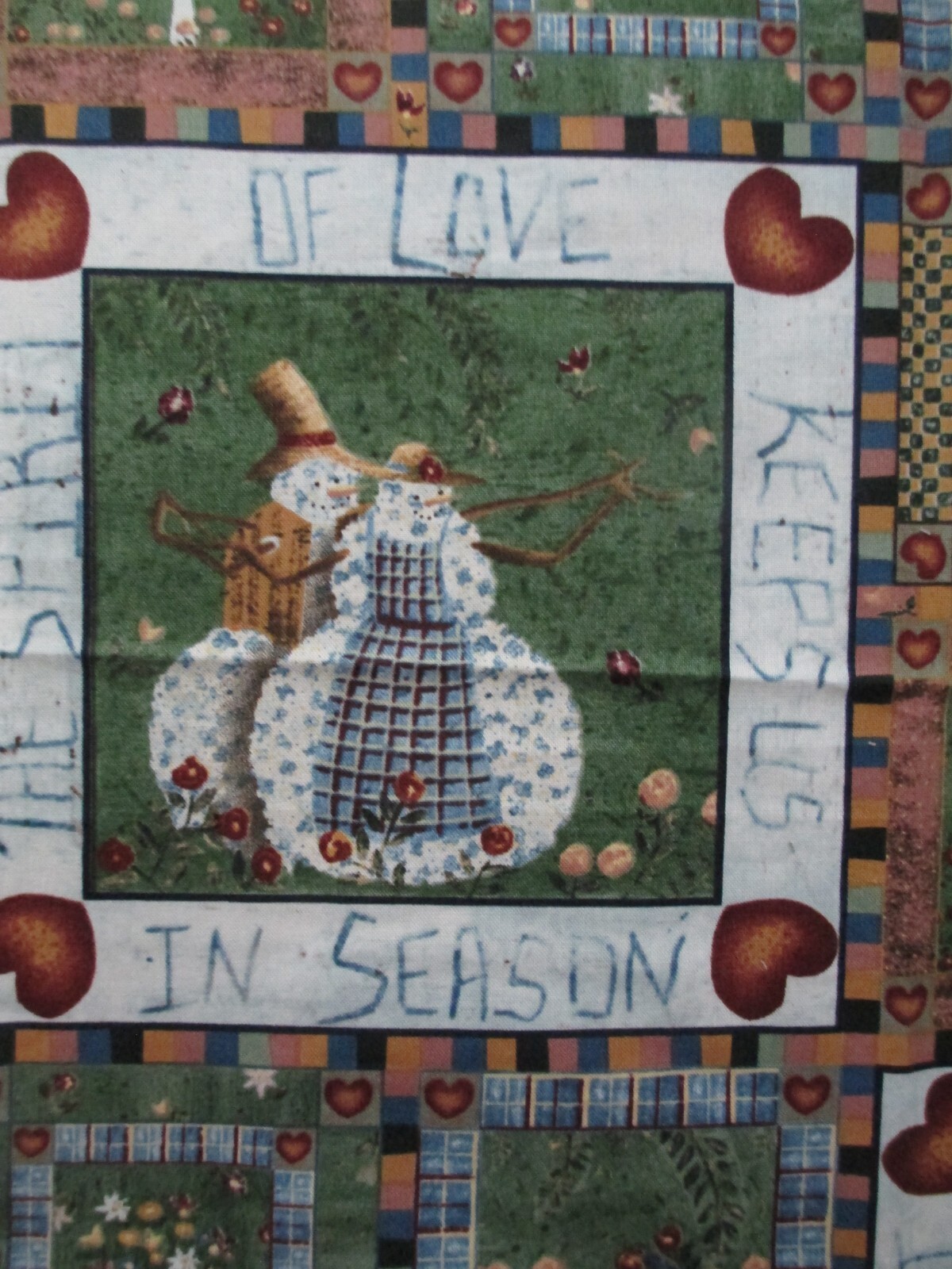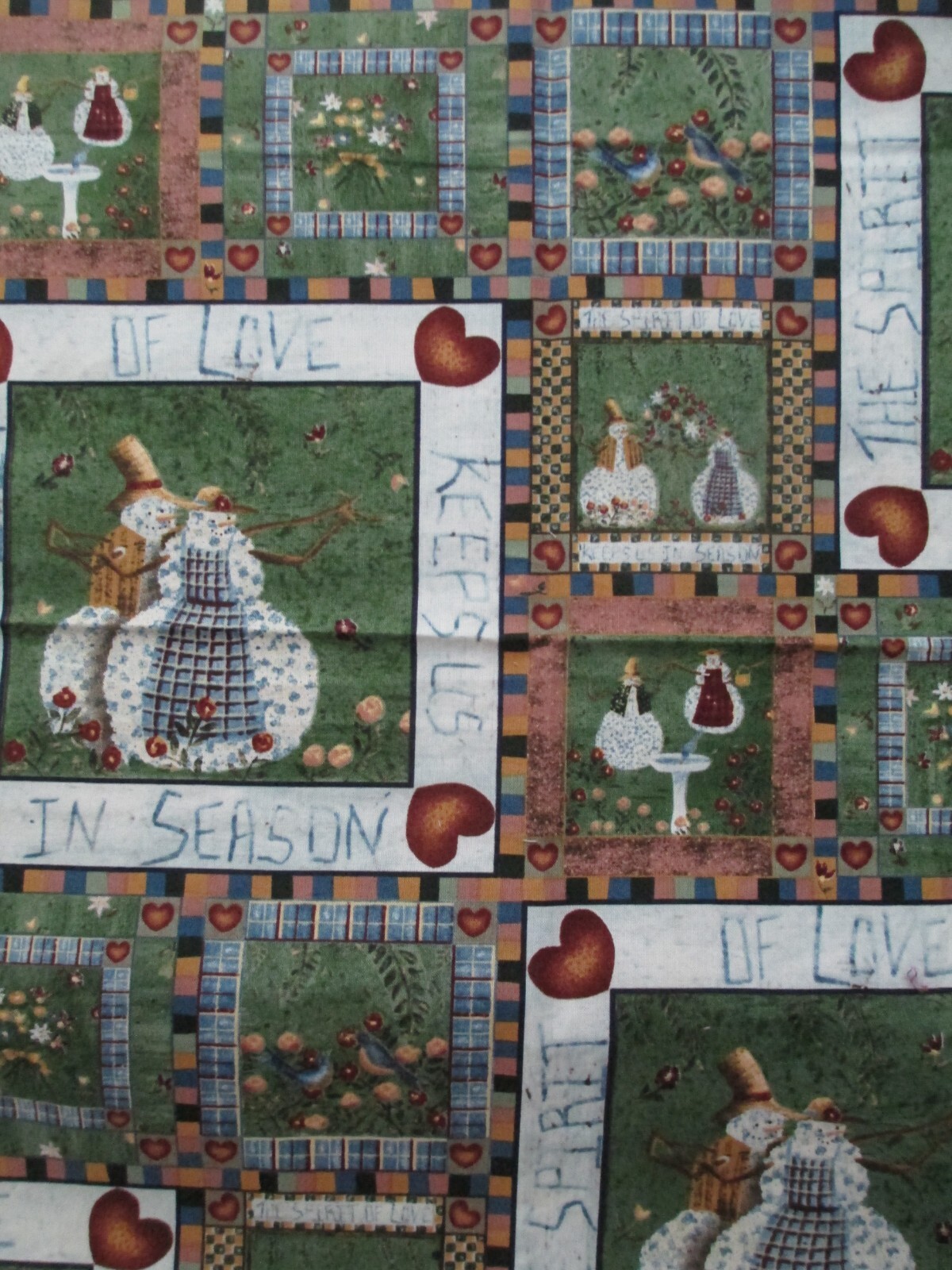 Photos 4-6 - The main piece of snowmen squares on asparagus green with smaller squares in a patchwork quilt design.
