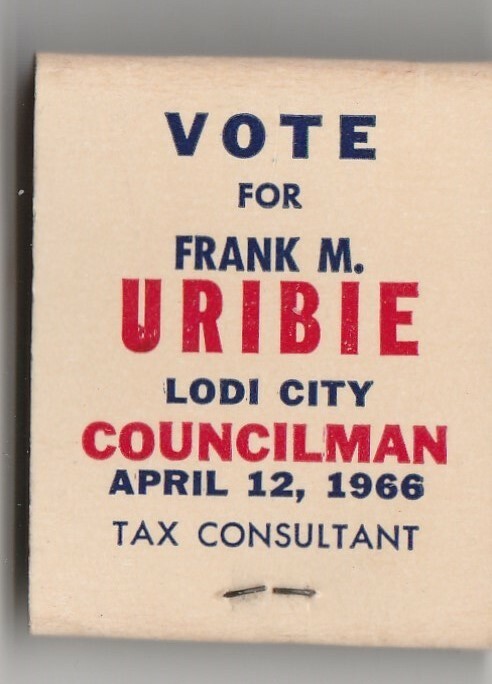 Vtg Strike on Matchbook Vote for Frank M. Uribie Lodi City Councilman 4/12/1966