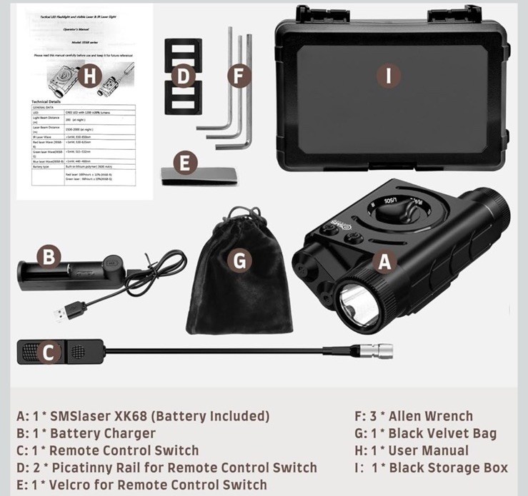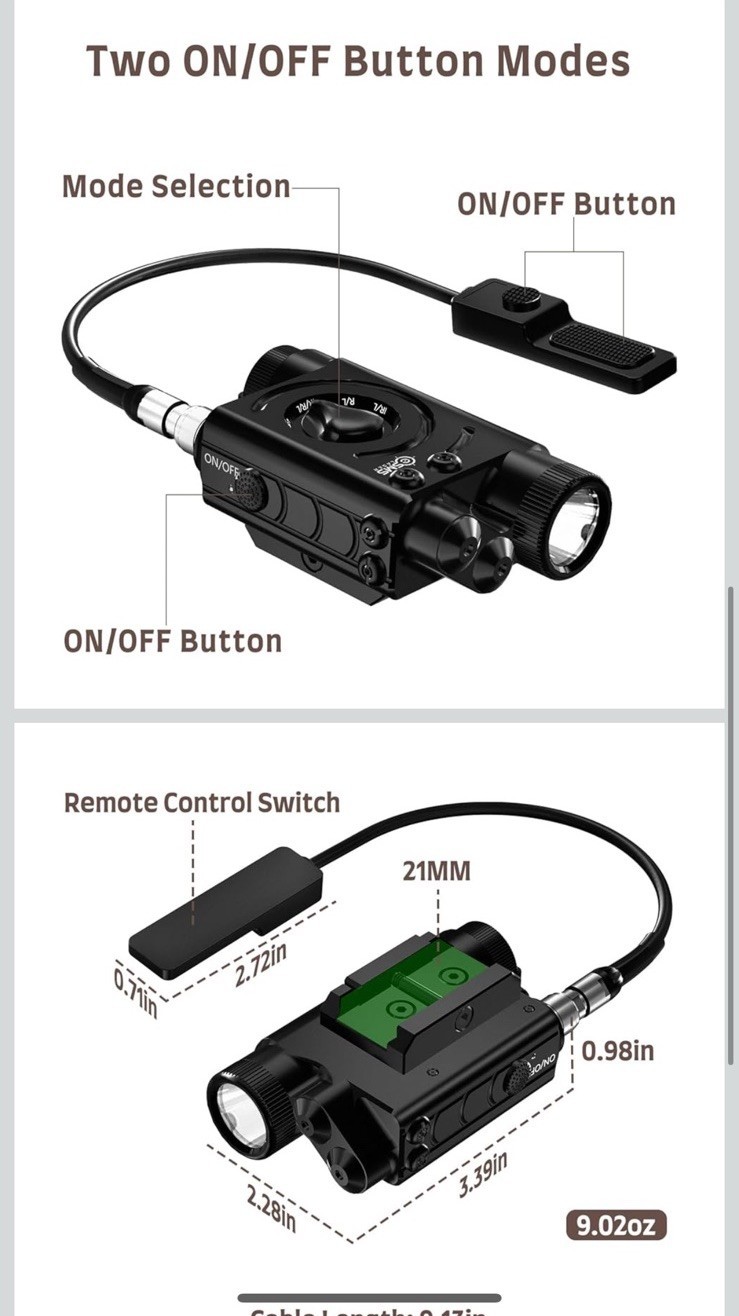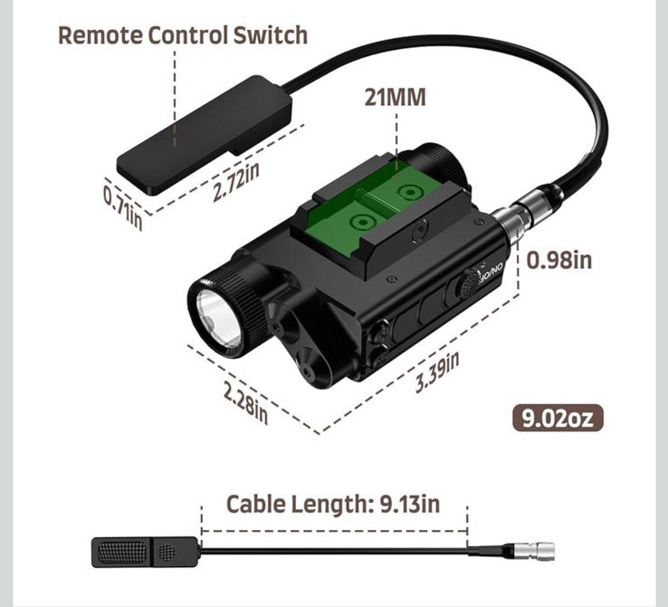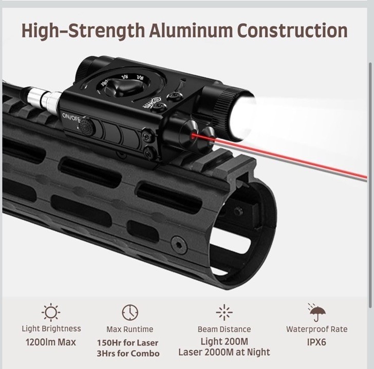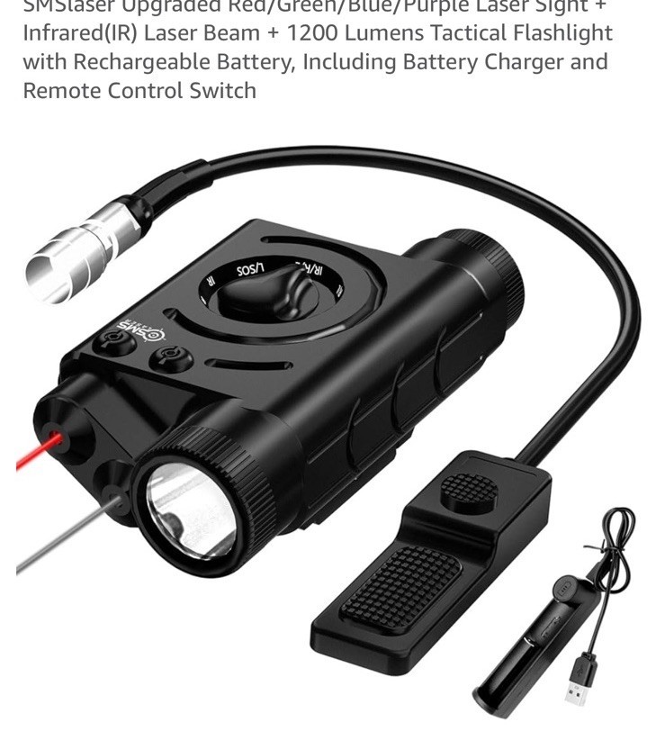 The SMSlaser Red Laser Sight with Infrared(IR) Laser Beam and 1200 Lumens Tactical Flashlight is a high-quality product designed for tactical use. This compact and lightweight device features a polished aluminum construction with a rifle mount for easy installation on your firearm. The red laser sight and 1200 lumens tactical flashlight provide precision and accuracy during shooting, while the lithium-ion battery ensures long runtime. Overall, this product is a valuable addition for those engaging in outdoor sports and target practice.