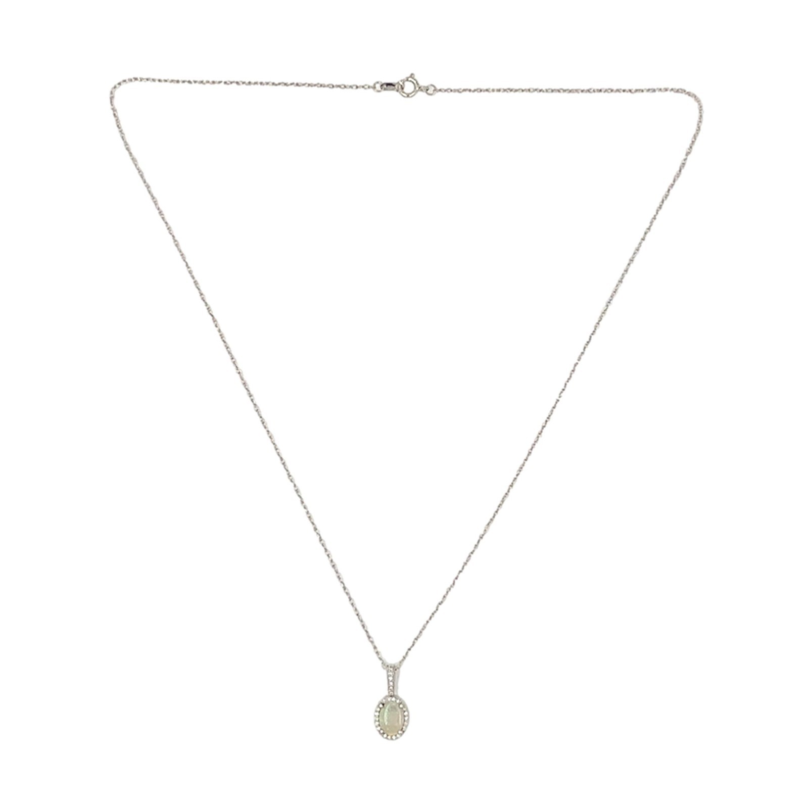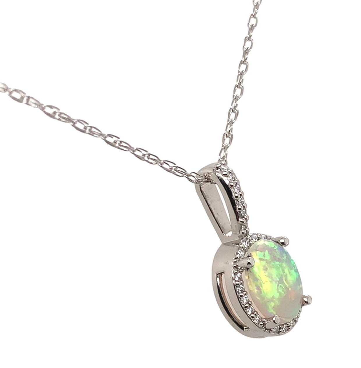A platinum genuine earth mined Australian opal pendant with diamond halo. The oval cabochon cut opal measures about 8mm x 6mm and has lively play of color with all colors including red. The opal weighs .60cts. There are twenty-four tiny round diamond accents weighing .06cts total.