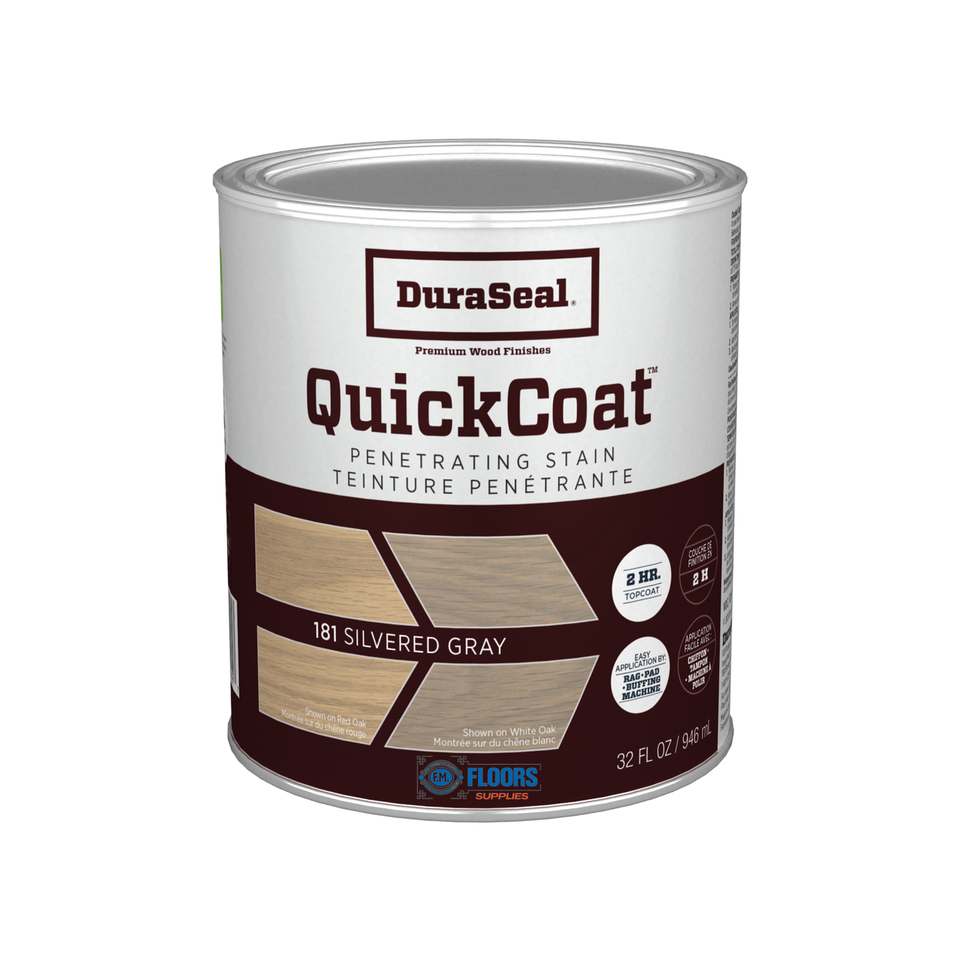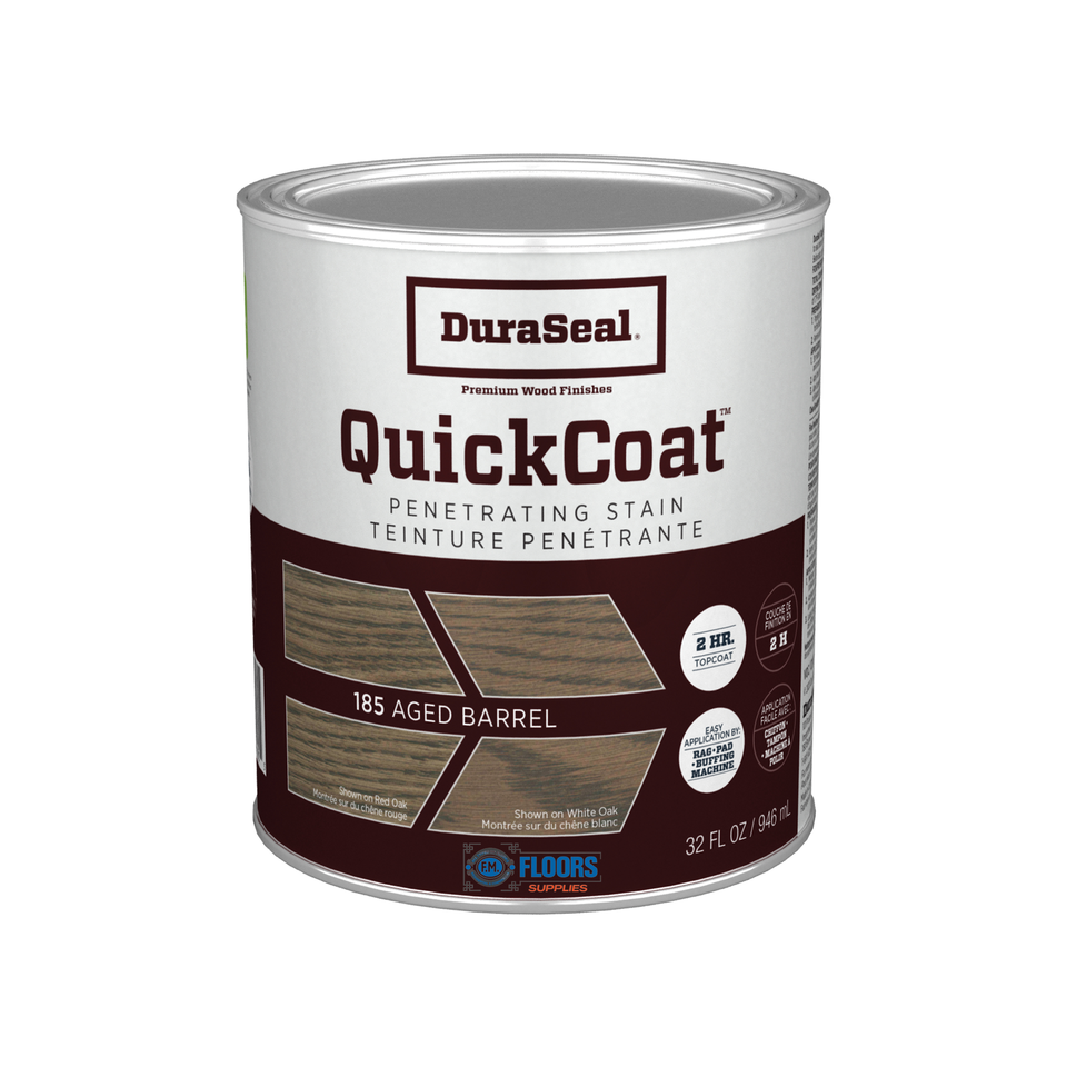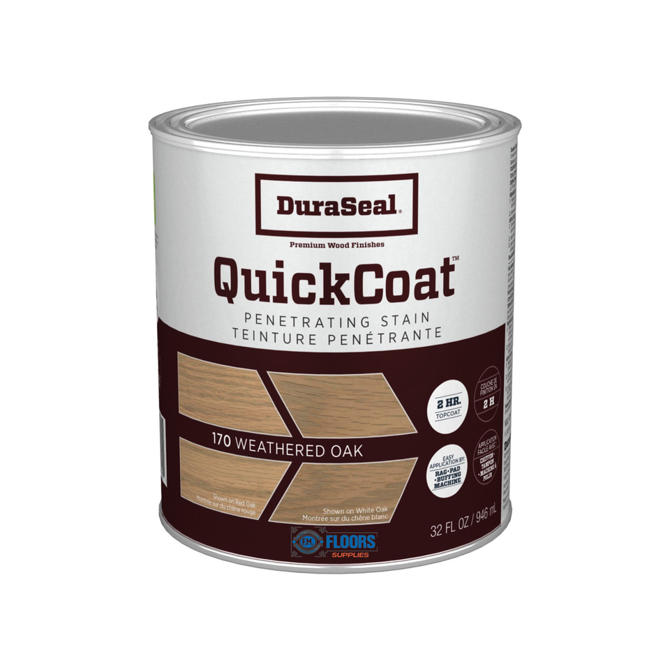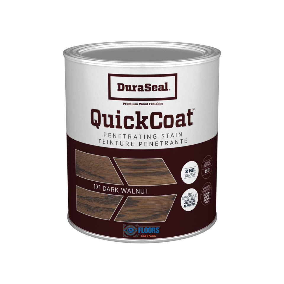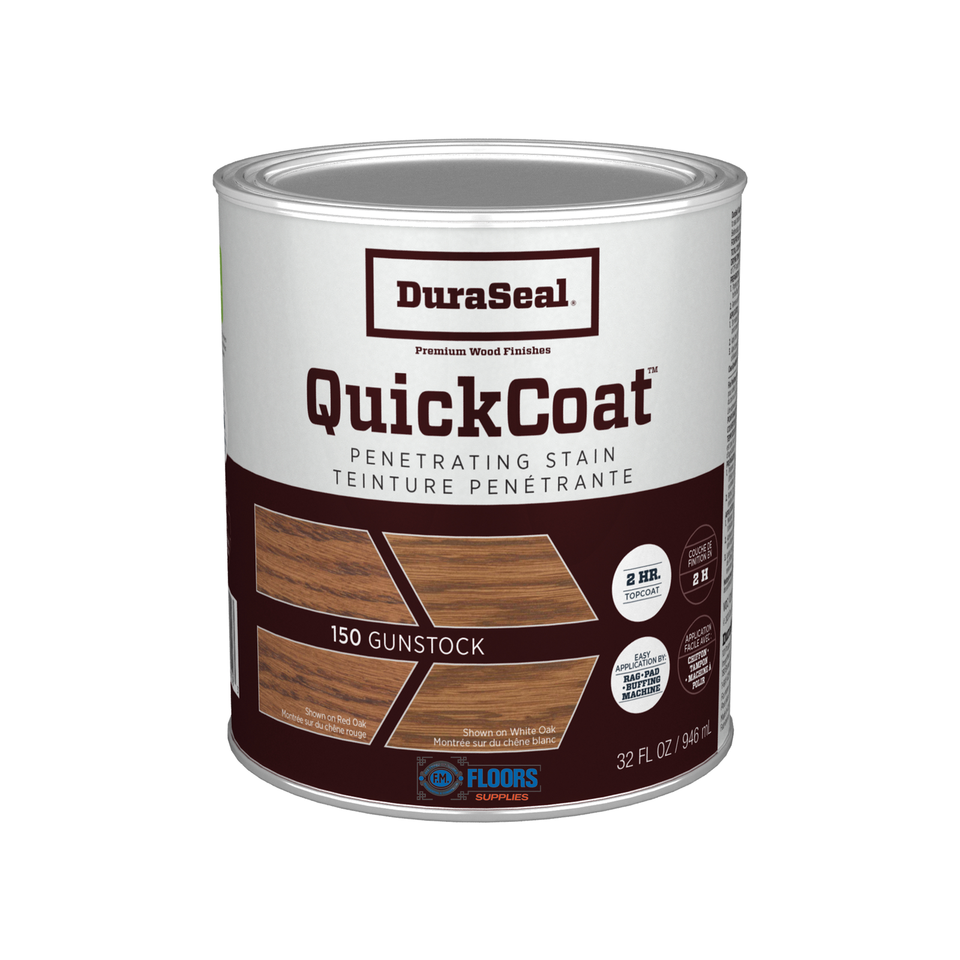 DESCRIPTION DuraSeal - Quick Coat Penetrating Finish is a semi-transparent stain formulated to seal, color and provide exceptional durability when used on bare wood and masonry surfaces. This rich blend of oil and resin gives hardwood floors a soft, satiny sheen. Its unique formulation provides a surface that can be top coated in two hours. DuraSeal Quick Coat Penetrating Finish is available in existing DuraSeal colors as well as many Certified Minwax colors. It can be used with or without a finish coat and is compatible with all DuraSeal water-borne and oil-modified finish systems. SURFACE PREPARATION Properly prepare floor according to NWFA specifications. Use a No.100 grit screen for the final screening cut. Remove all dust with a vacuum and tack surface with a clean cloth moistened with mineral spirits. APPLICATION Shake material thoroughly before and occasionally during use. Apply to a small test area before proceeding with the entire job to ensure desired color. If desired, DuraSeal Quick Coat Penetrating Finish #110 Neutral can be used to lighten any standard DuraSeal wood tone. Apply the first coat of DuraSeal Quick Coat Penetrating Finish liberally with a brush, lambswool applicator or cloth at approximately 500 square feet per gallon. Allow to penetrate for 5-8 minutes, then remove excess by wiping with rags or by buffing with #2 steel wool. Removal of all excess material is essential to ensure proper dry time and adhesion of the finish coat. If desired, apply a thin second coat at a coverage rate of approximately 800 square feet per gallon. Allow to penetrate and remove excess material in the same manner as the first coat (step 3 above). Allow the final coat to dry at least 2 hours and apply a DuraSeal finish coat of your choice. IMPORTANT Place rags, steel wool and other waste immediately after use in a sealed, water-filled metal container. See cautionary statement DRY TIME AND CURE Approximately 2-3 hours. Note: Dry time is based on conditions of 77 and 50% relative humidity. COVERAGE First coat ? approximately 500 square feet per gallon. Optional second coat ? approximately 800 sq.ft. per gallon. CLEAN UP Application tools should be cleaned with mineral spirits or paint thinner immediately after use. SOLVENT Non-photochemically reactive. MAINTENANCE Regularly remove dust and dirt by sweeping or vacuuming. Periodic buffing will renew luster. Exceptionally worn areas may require an additional finish coat. Maintain floors sealed only with DuraSeal Quick Coat Penetrating Finish with DuraSeal Renovator Cleaner and Reconditioner. STORAGE Store at room temperature. If stored at high temperature, cool to room temperature before use. Keep from freezing.