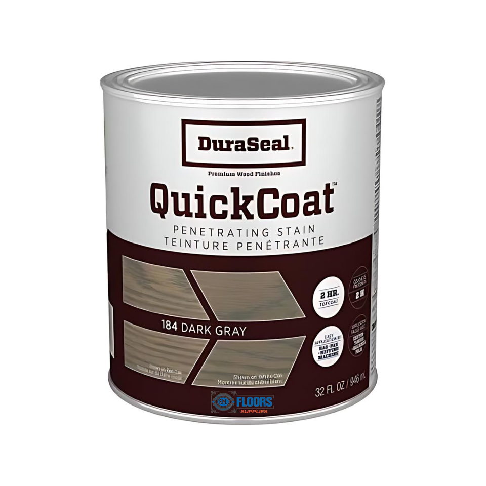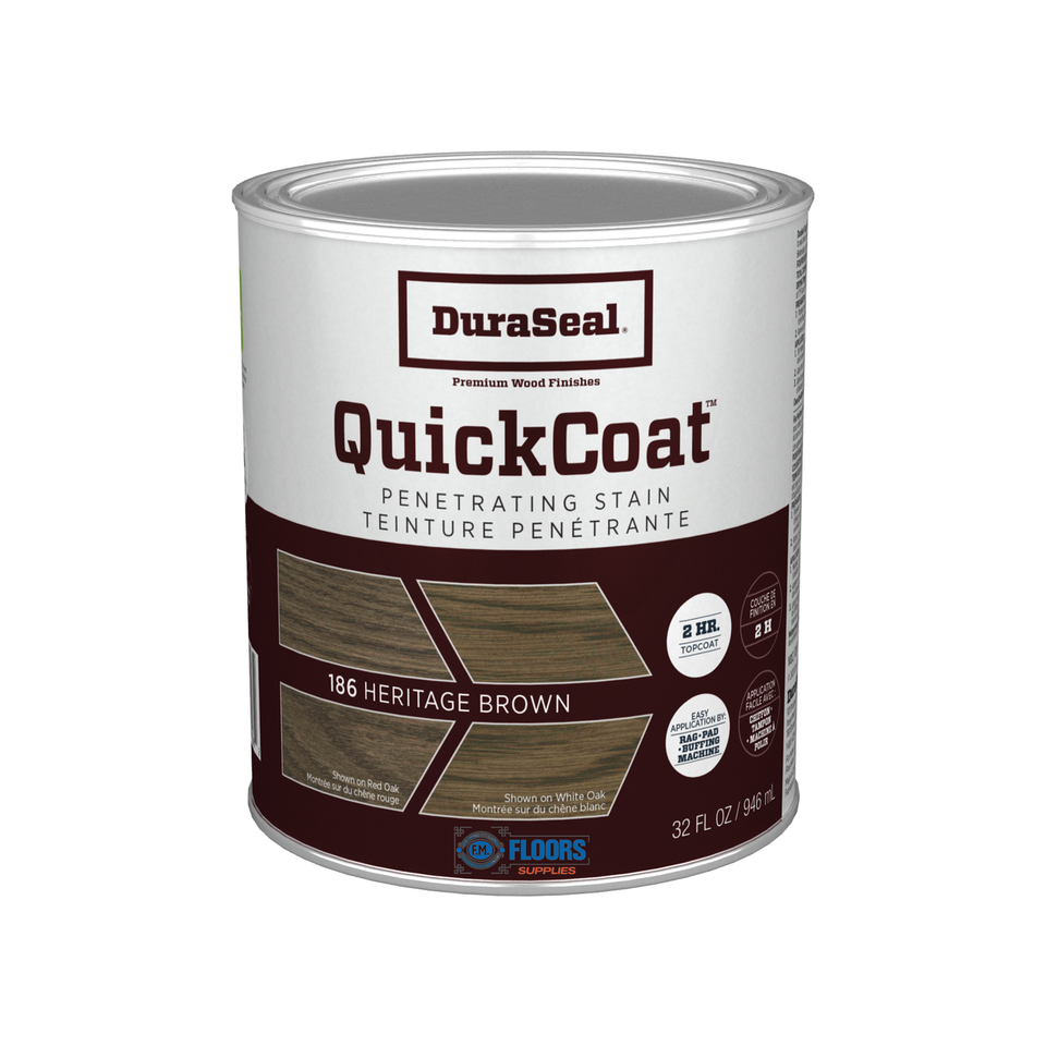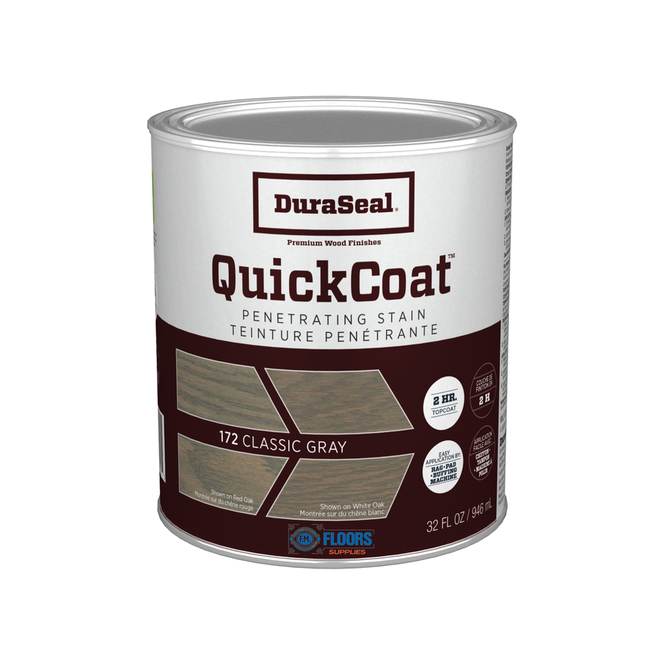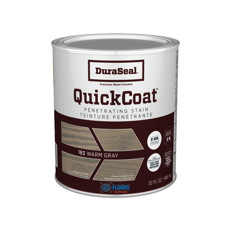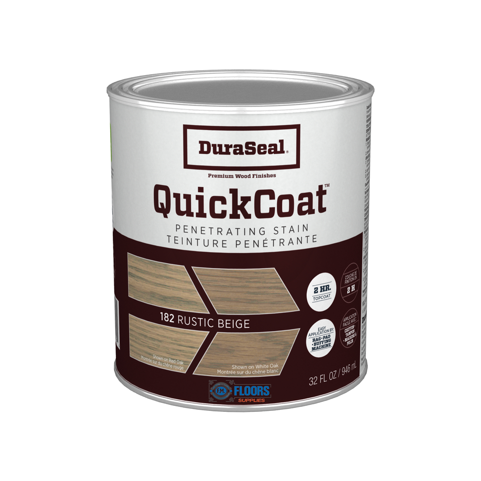 DESCRIPTION DuraSeal - Quick Coat Penetrating Finish is a semi-transparent stain formulated to seal, color and provide exceptional durability when used on bare wood and masonry surfaces. This rich blend of oil and resin gives hardwood floors a soft, satiny sheen. Its unique formulation provides a surface that can be top coated in two hours. DuraSeal Quick Coat Penetrating Finish is available in existing DuraSeal colors as well as many Certified Minwax colors. It can be used with or without a finish coat and is compatible with all DuraSeal water-borne and oil-modified finish systems. SURFACE PREPARATION Properly prepare floor according to NWFA specifications. Use a No.100 grit screen for the final screening cut. Remove all dust with a vacuum and tack surface with a clean cloth moistened with mineral spirits. APPLICATION Shake material thoroughly before and occasionally during use. Apply to a small test area before proceeding with the entire job to ensure desired color. If desired, DuraSeal Quick Coat Penetrating Finish #110 Neutral can be used to lighten any standard DuraSeal wood tone. Apply the first coat of DuraSeal Quick Coat Penetrating Finish liberally with a brush, lambswool applicator or cloth at approximately 500 square feet per gallon. Allow to penetrate for 5-8 minutes, then remove excess by wiping with rags or by buffing with #2 steel wool. Removal of all excess material is essential to ensure proper dry time and adhesion of the finish coat. If desired, apply a thin second coat at a coverage rate of approximately 800 square feet per gallon. Allow to penetrate and remove excess material in the same manner as the first coat (step 3 above). Allow the final coat to dry at least 2 hours and apply a DuraSeal finish coat of your choice. IMPORTANT Place rags, steel wool and other waste immediately after use in a sealed, water-filled metal container. See cautionary statement DRY TIME AND CURE Approximately 2-3 hours. Note: Dry time is based on conditions of 77 and 50% relative humidity. COVERAGE First coat ? approximately 500 square feet per gallon. Optional second coat ? approximately 800 sq.ft. per gallon. CLEAN UP Application tools should be cleaned with mineral spirits or paint thinner immediately after use. SOLVENT Non-photochemically reactive. MAINTENANCE Regularly remove dust and dirt by sweeping or vacuuming. Periodic buffing will renew luster. Exceptionally worn areas may require an additional finish coat. Maintain floors sealed only with DuraSeal Quick Coat Penetrating Finish with DuraSeal Renovator Cleaner and Reconditioner. STORAGE Store at room temperature. If stored at high temperature, cool to room temperature before use. Keep from freezing.