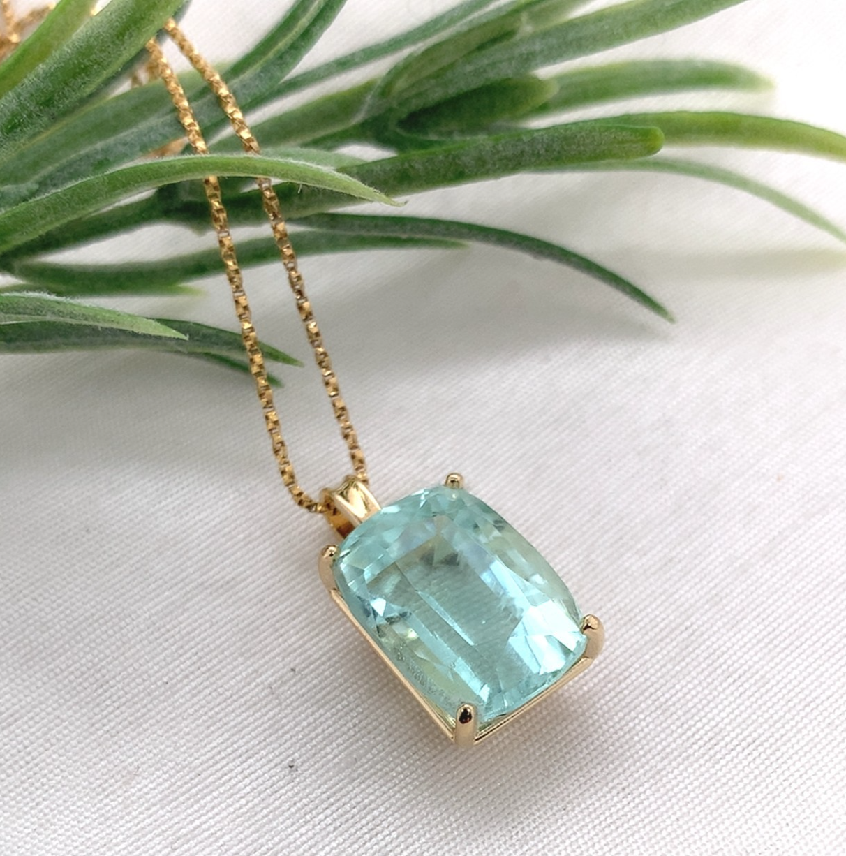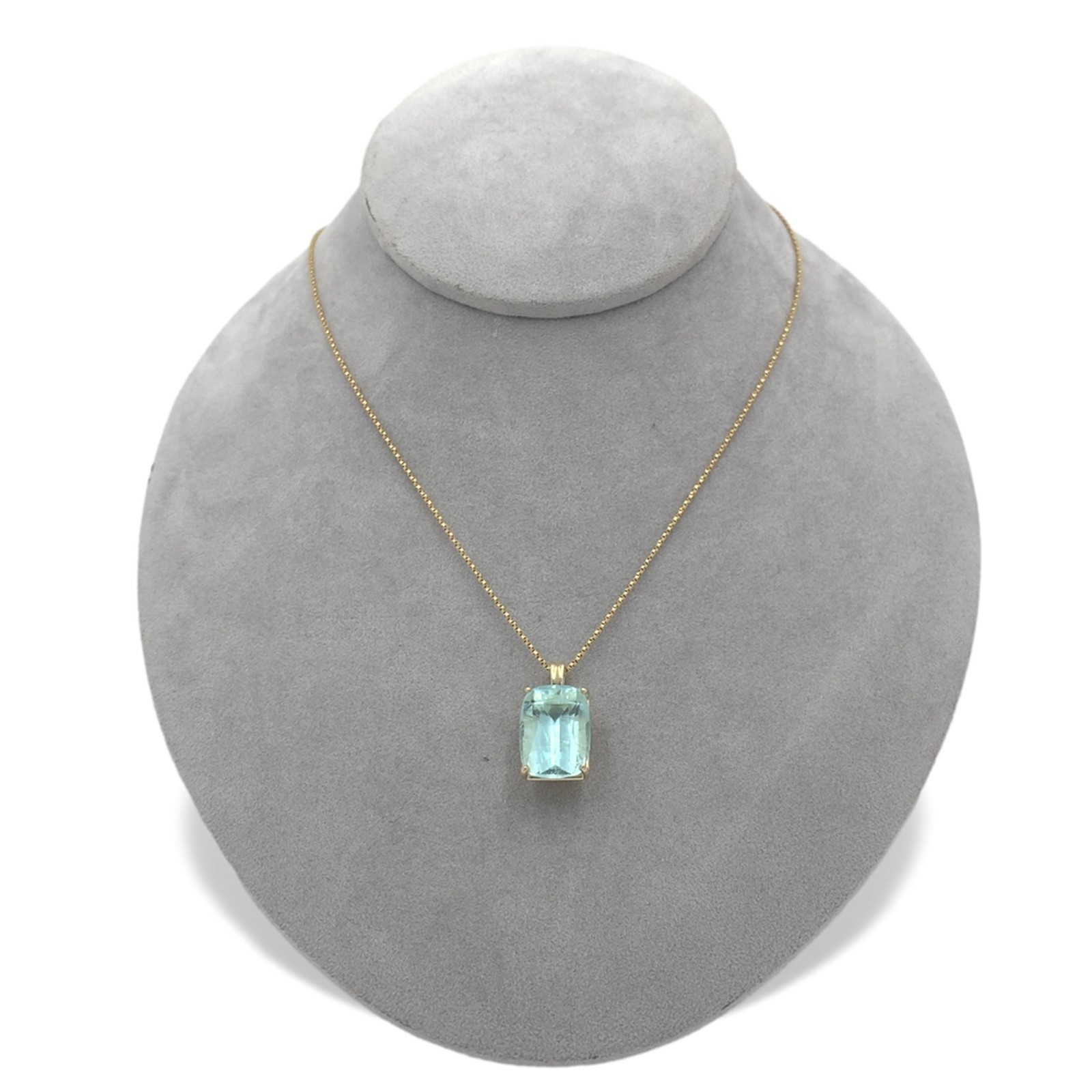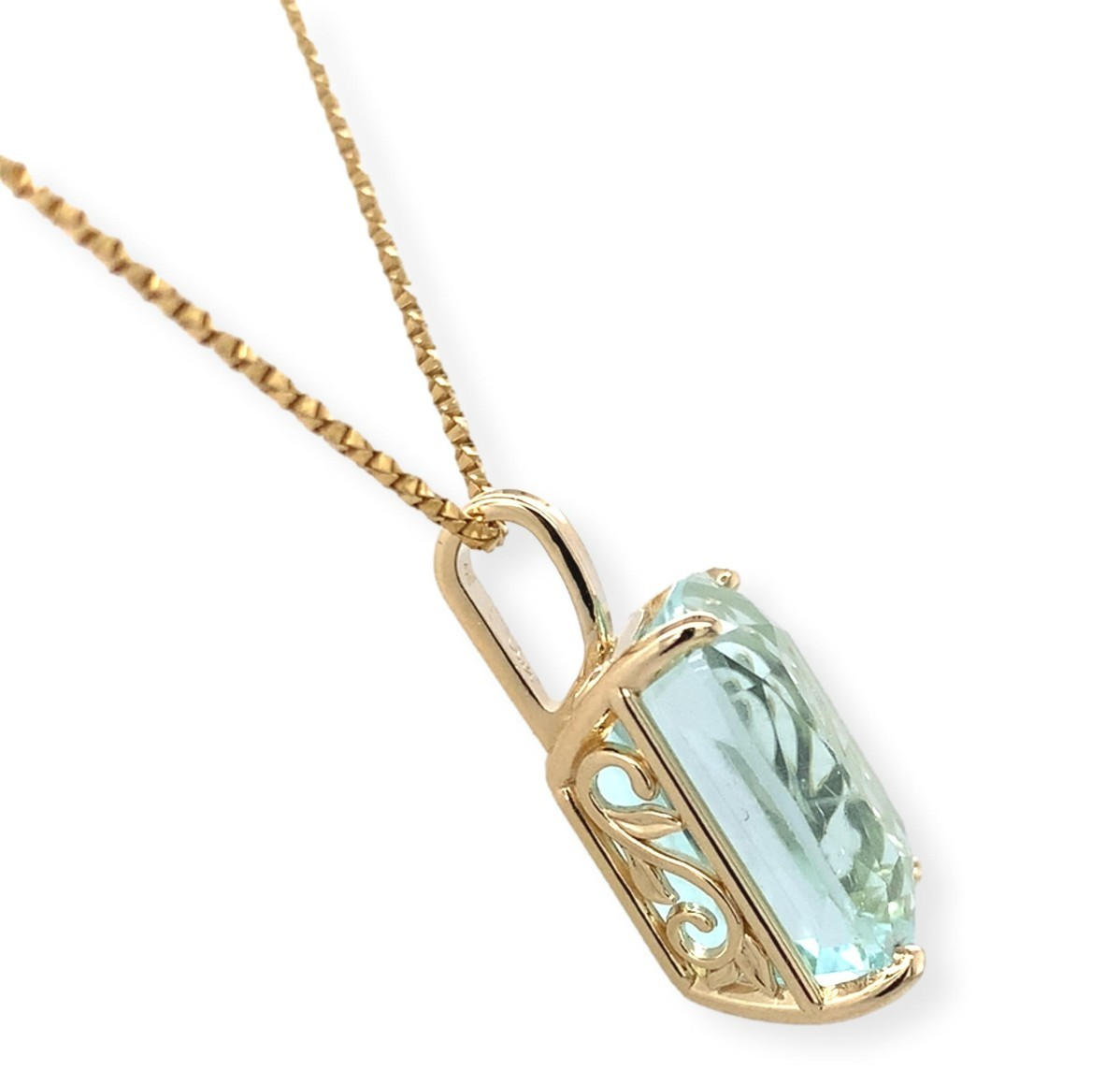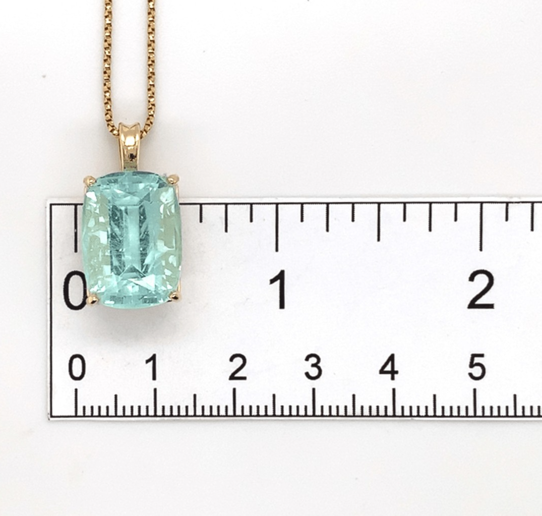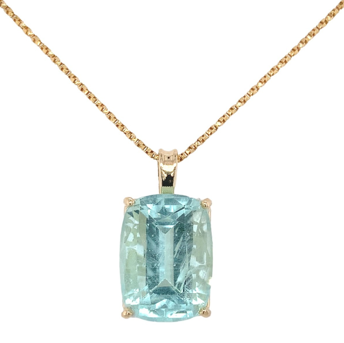 14k yellow gold genuine earth mined aquamarine pendant. The cushion cut aquamarine weighs 12.82 carats and measures about 16.5mm x 12mm. The aquamarine has light sky blue color. The pendant measures 7/8" long with bail by 1/2" wide and includes a 24" 14k chain. The necklace weighs 4.94 dwt., and is contemporary. Wow!