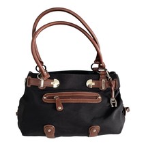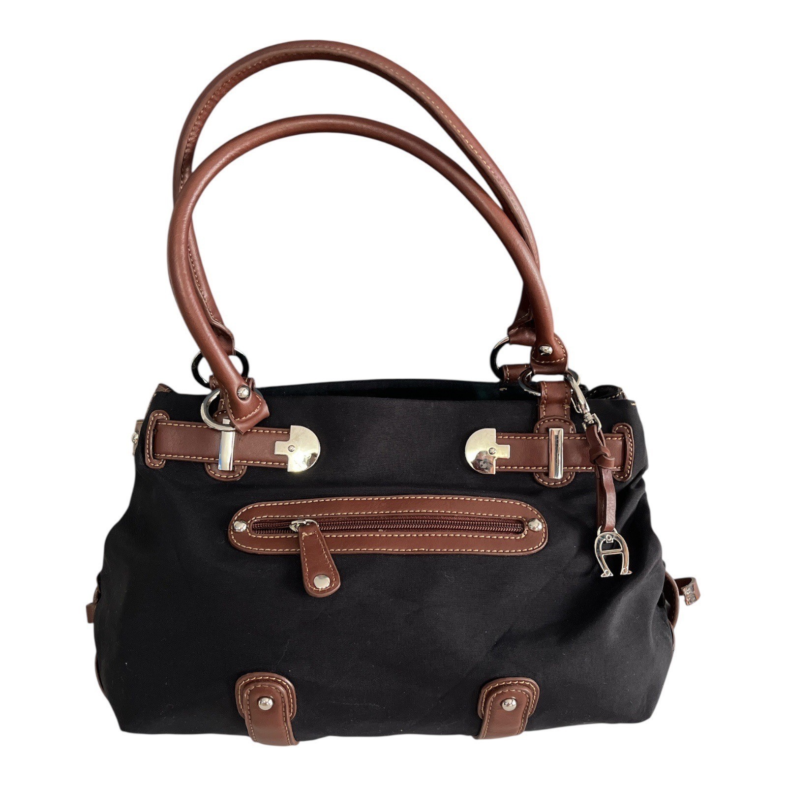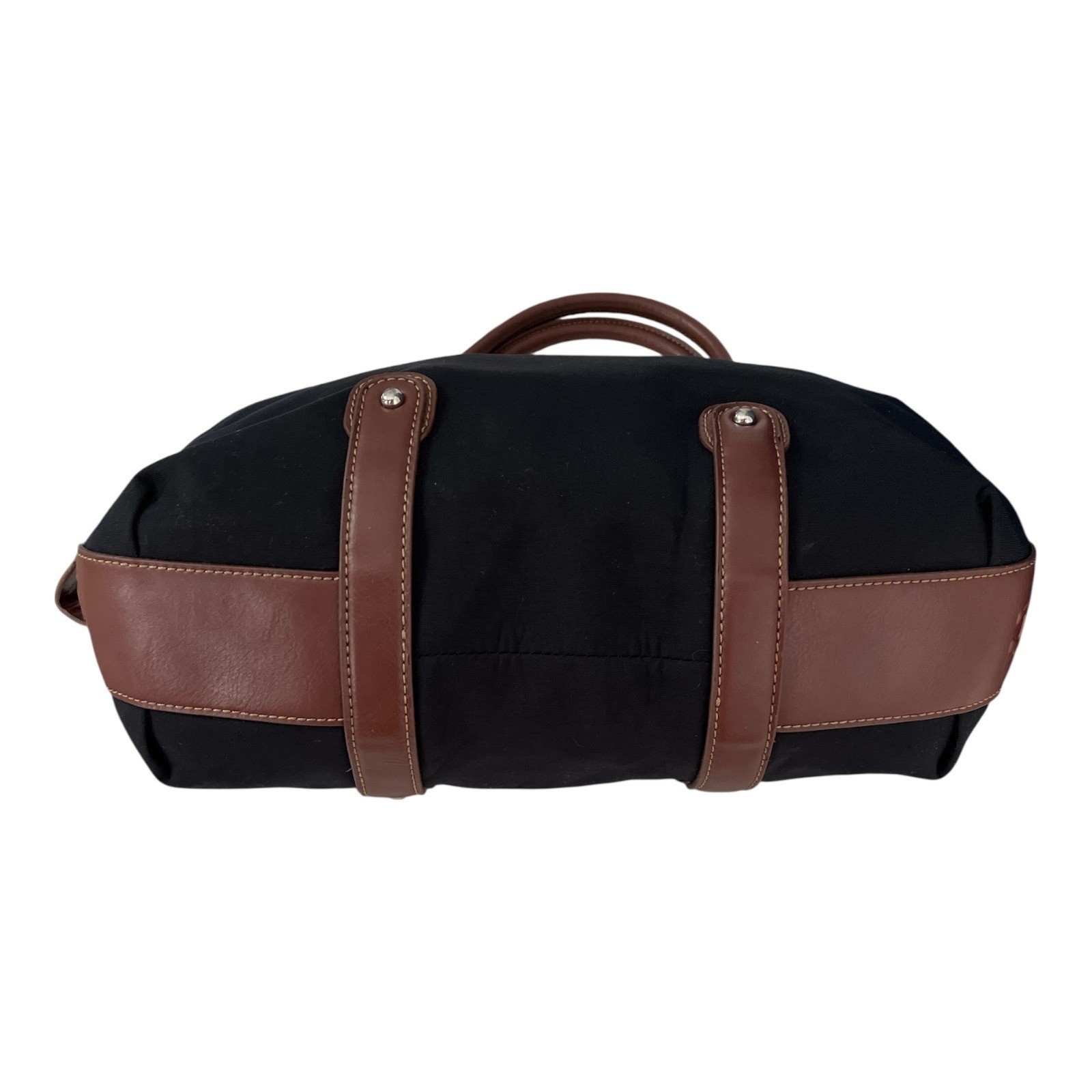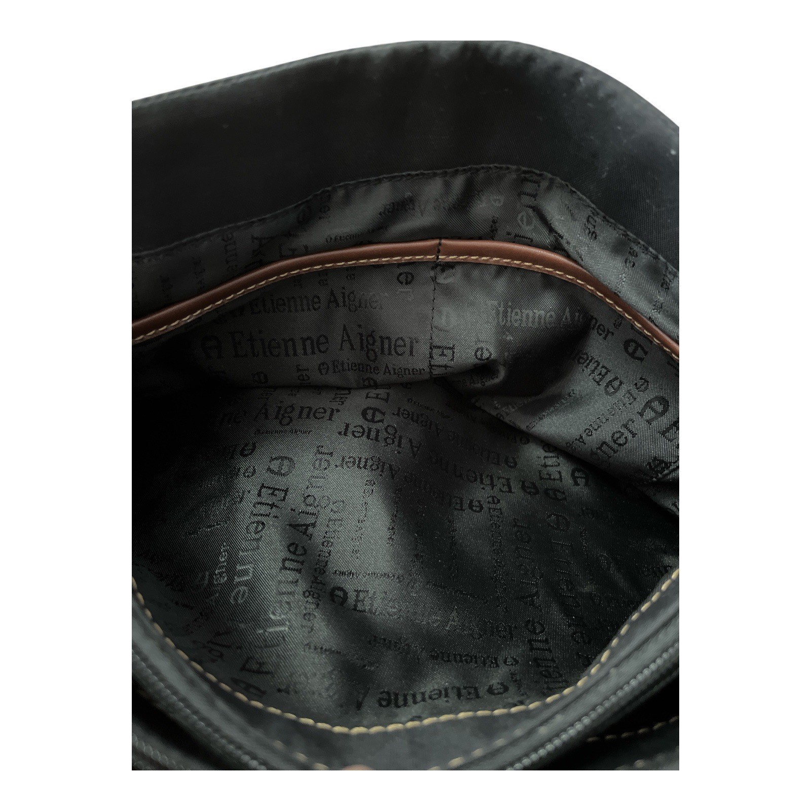 Etienne Aigner Black Canvas Satchel Tote Bag Brown Leather Trim Logo Charm – Eas
