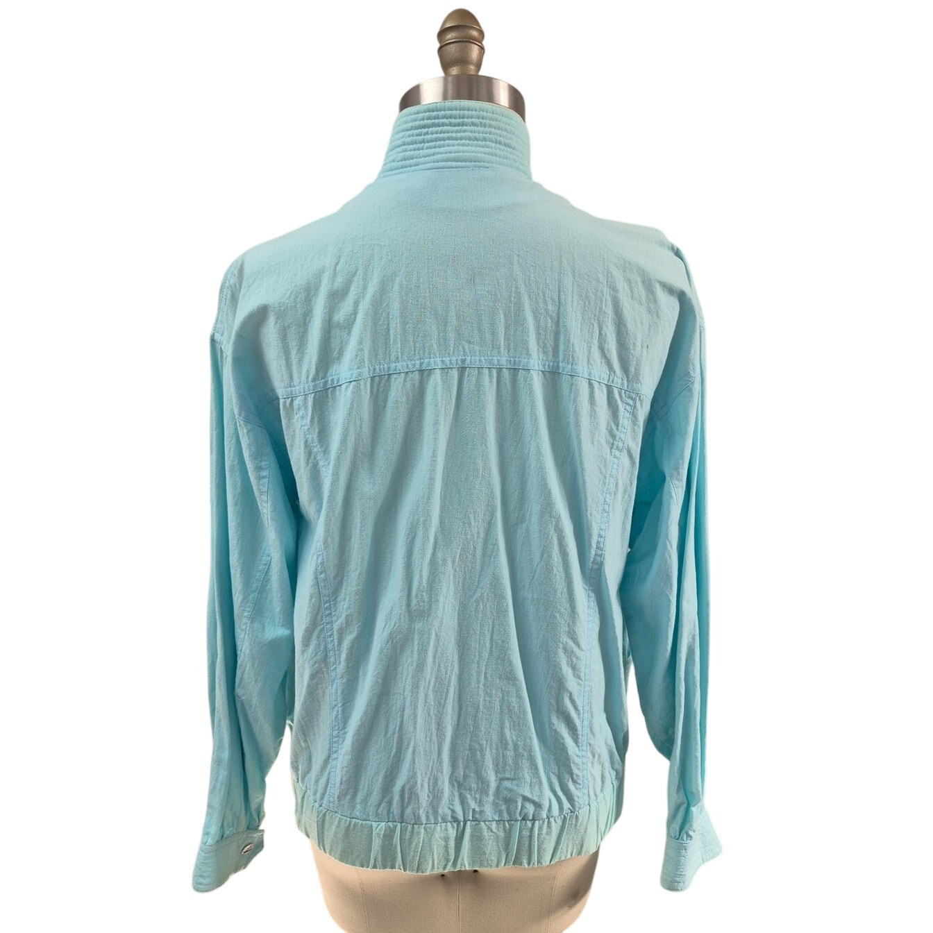 Vintage 80s 90s Aqua Blue 100% Cotton Jacket Unique Swirl Accents Women L - it is in as found condition, it has a tiny stain on the front pocket as shown