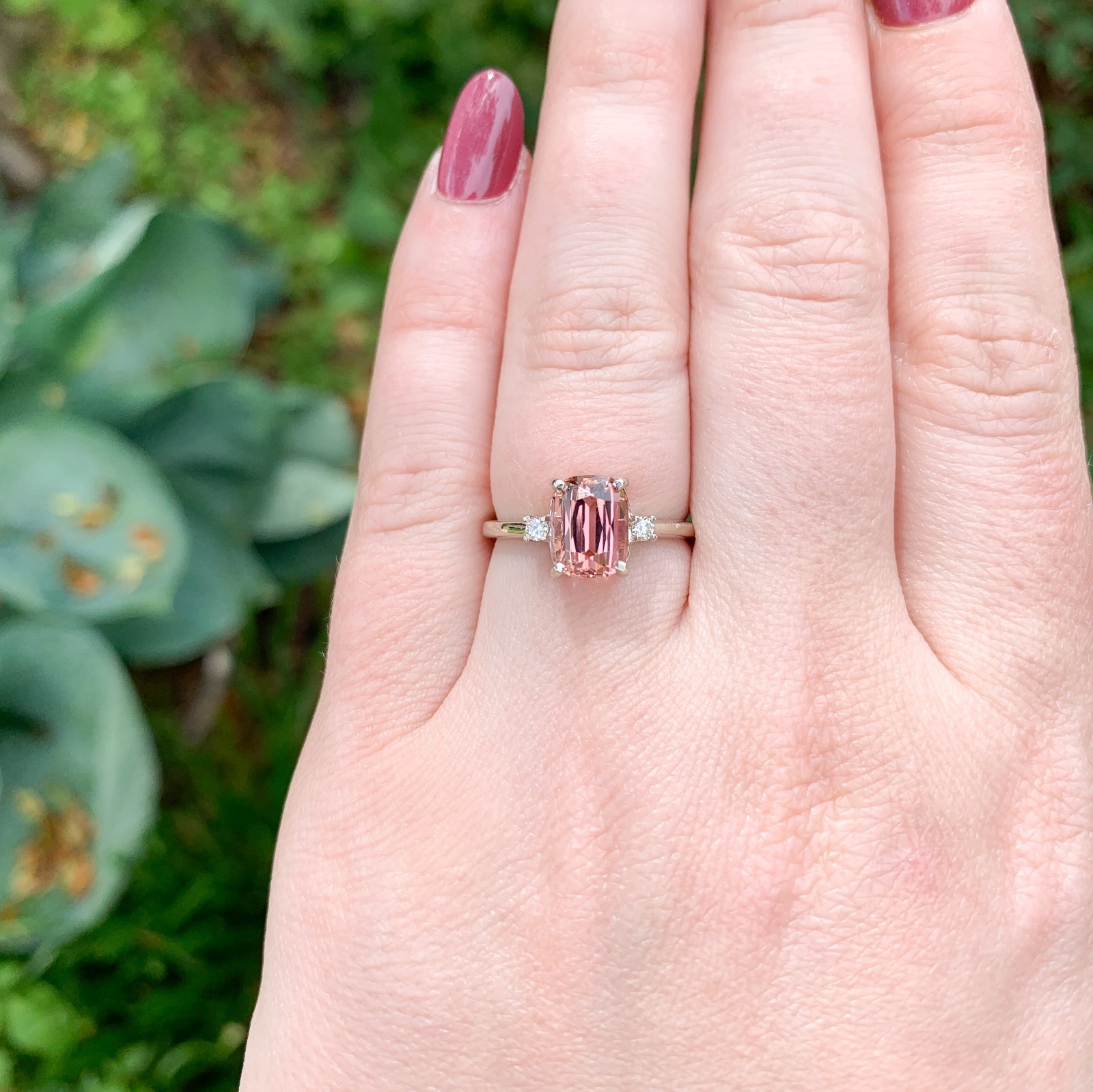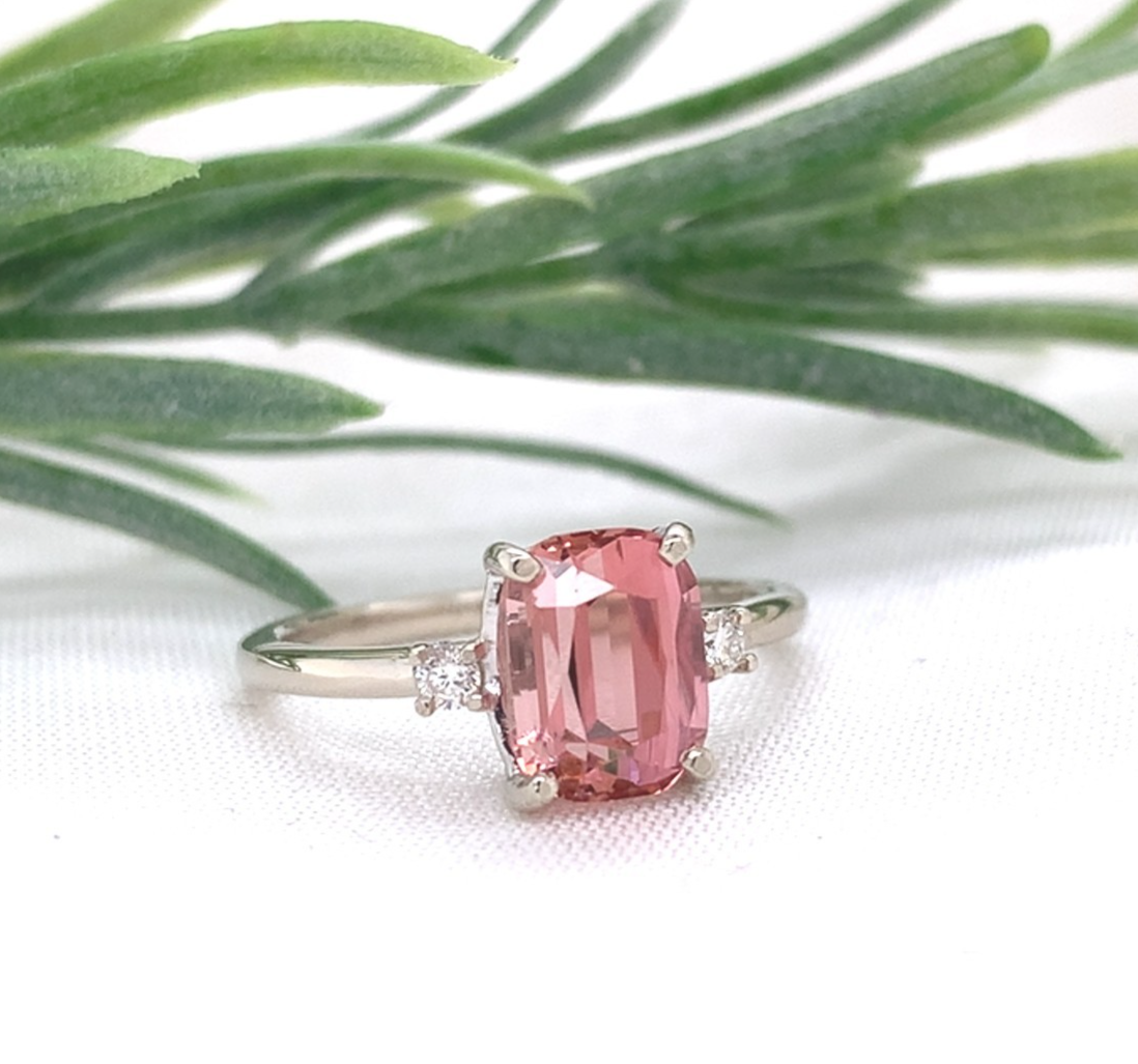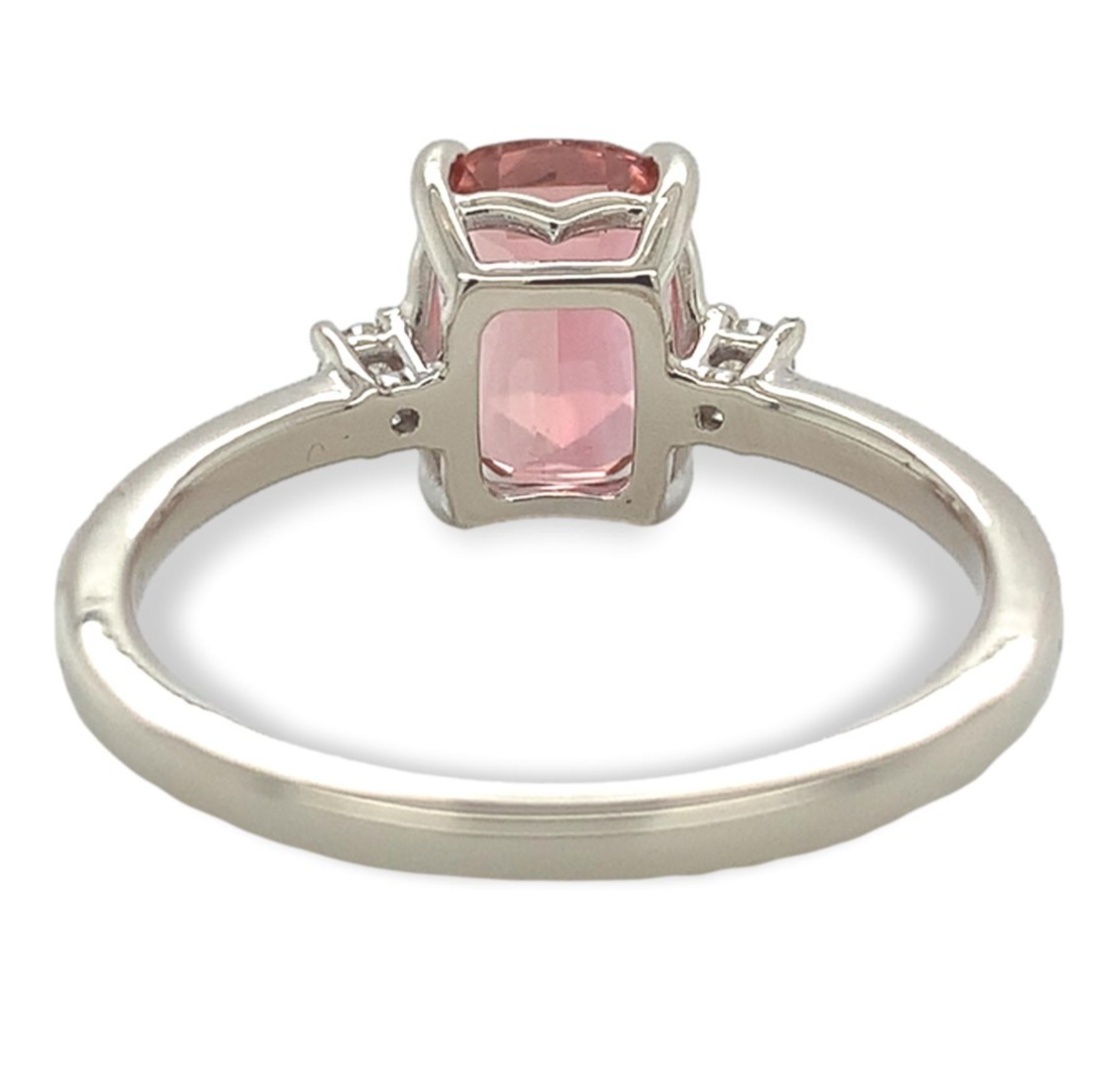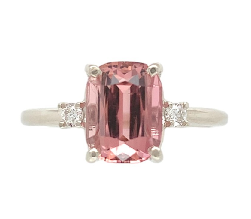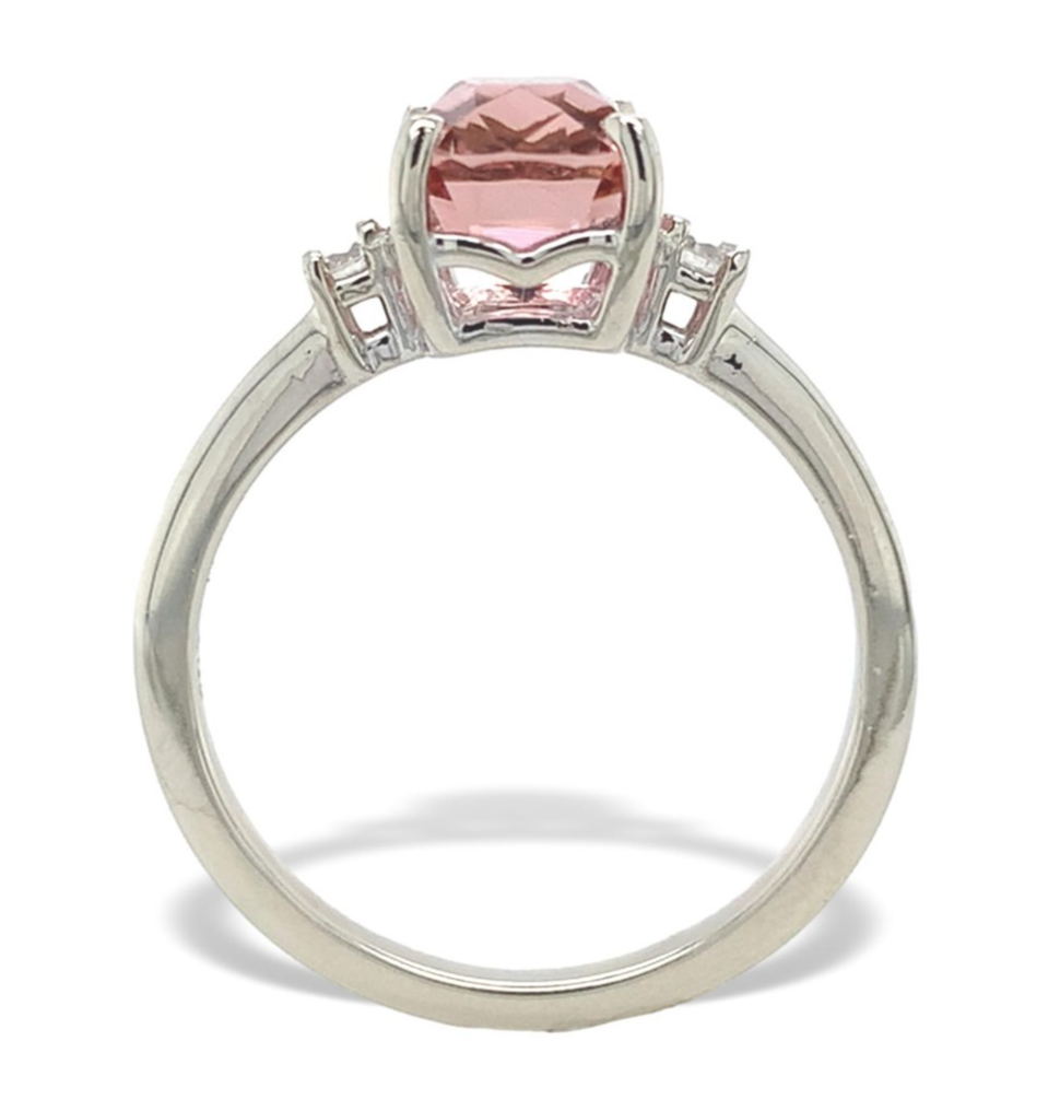 A 14k white gold ring featuring a pink tourmaline weighing 2.24 carats. The genuine earth mined tourmaline has warm peachy-pink color. The tourmaline is a beautifully faceted oval/cushion cut and measures about 8.5mm x 6.4mm. There are two small round brilliant cut genuine earth mined diamond accents measuring about 2mm.
