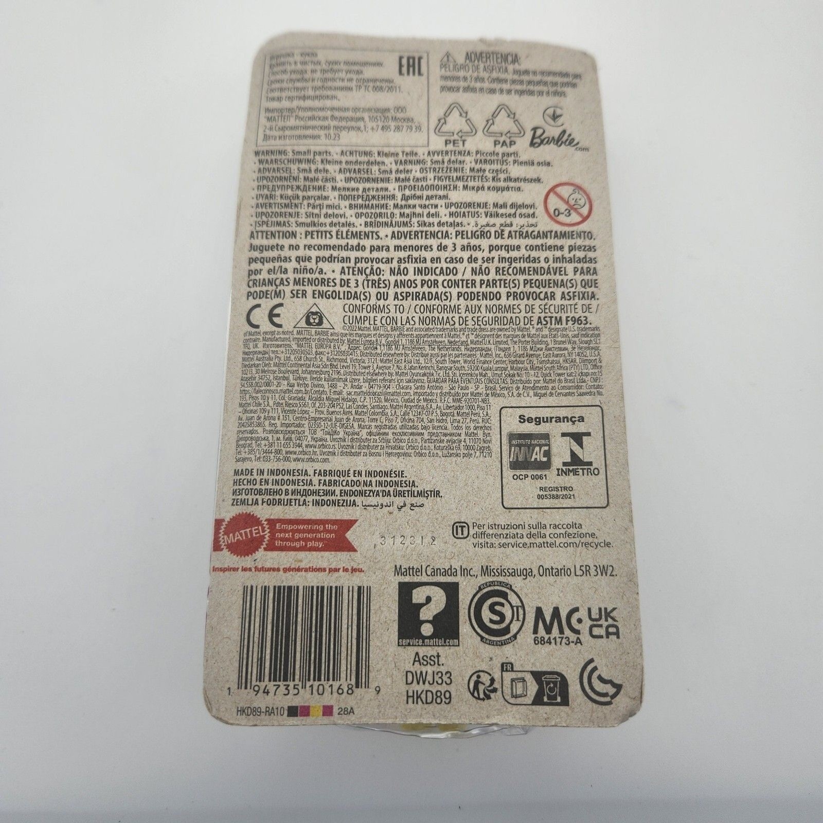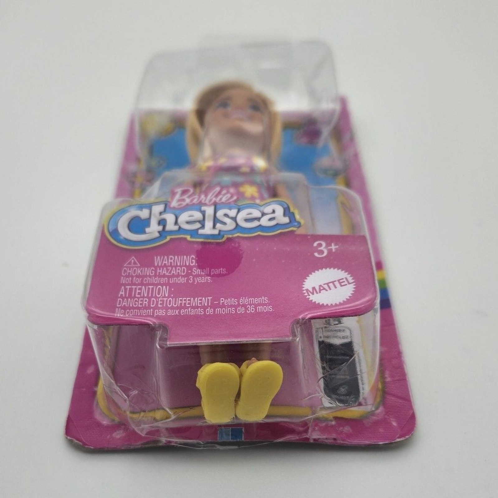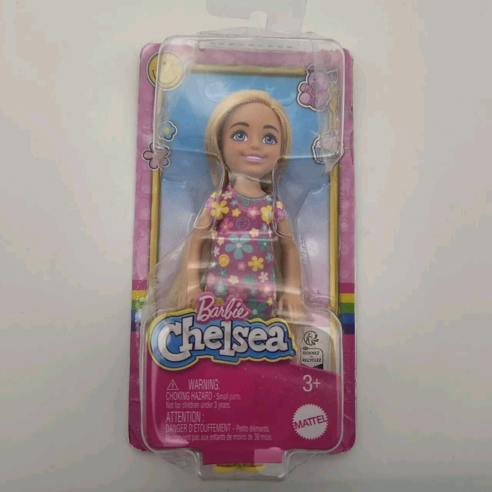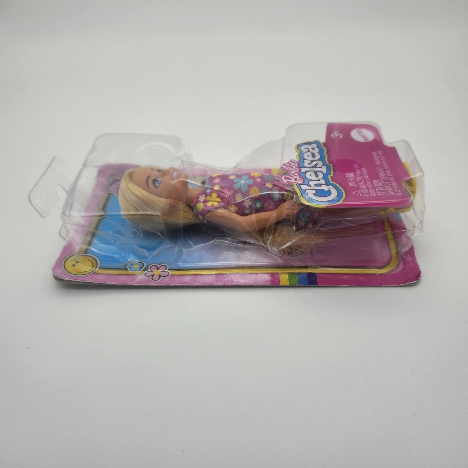 This cheerful Chelsea doll features bright blonde hair, a purple floral dress, and matching yellow shoes ? a fun and colorful addition to any Barbie lineup.