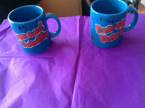 These mugs have the words "Don and Dorothy" on one side and an image of a man and woman dressed in Miami Dolphin's uniforms on the other side. The mugs are 3.5'' in height.