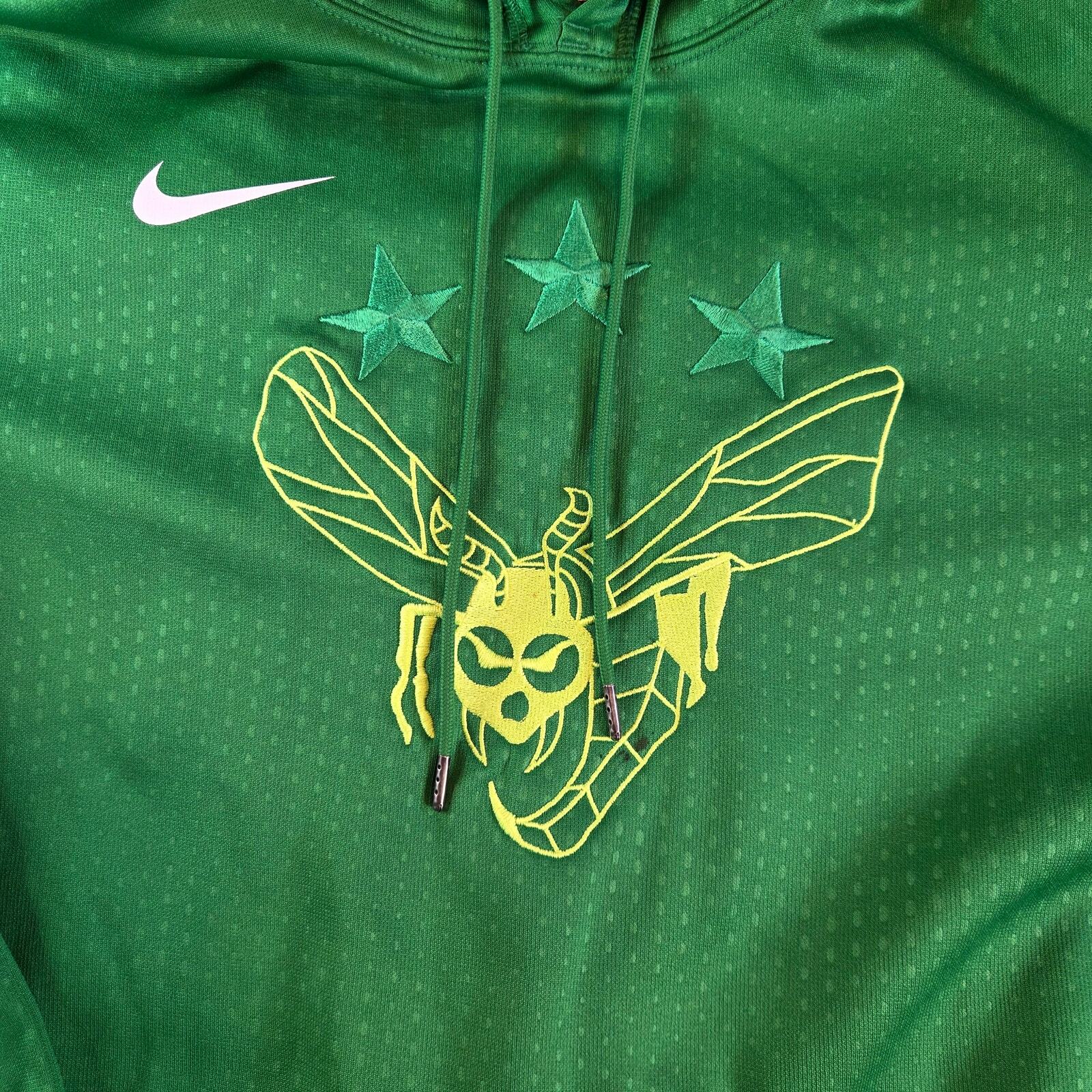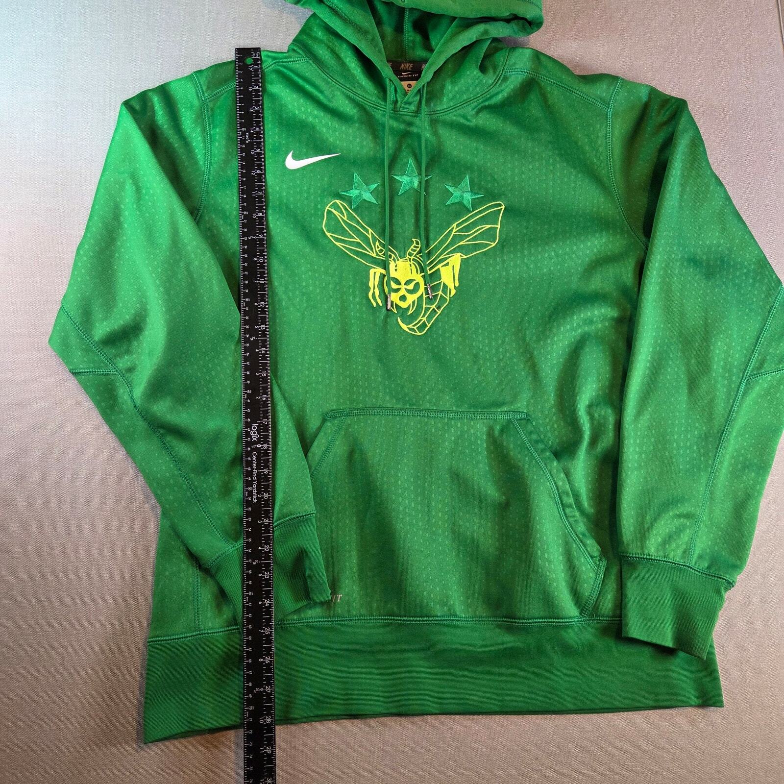 Nike Therma-Fit men?s hoodie in bold green with rare insect/skull winged logo graphic on chest. Lightweight, warm, and breathable polyester fabric with fleece lining. Adjustable drawstring hood, kangaroo front pocket, and ribbed cuffs/hem. Unique design ? difficult to find online.