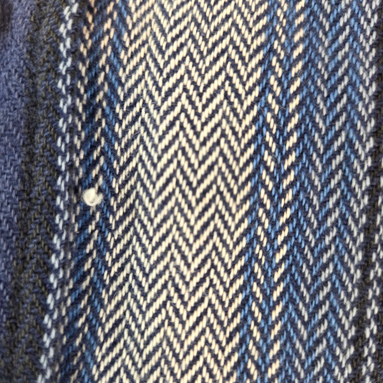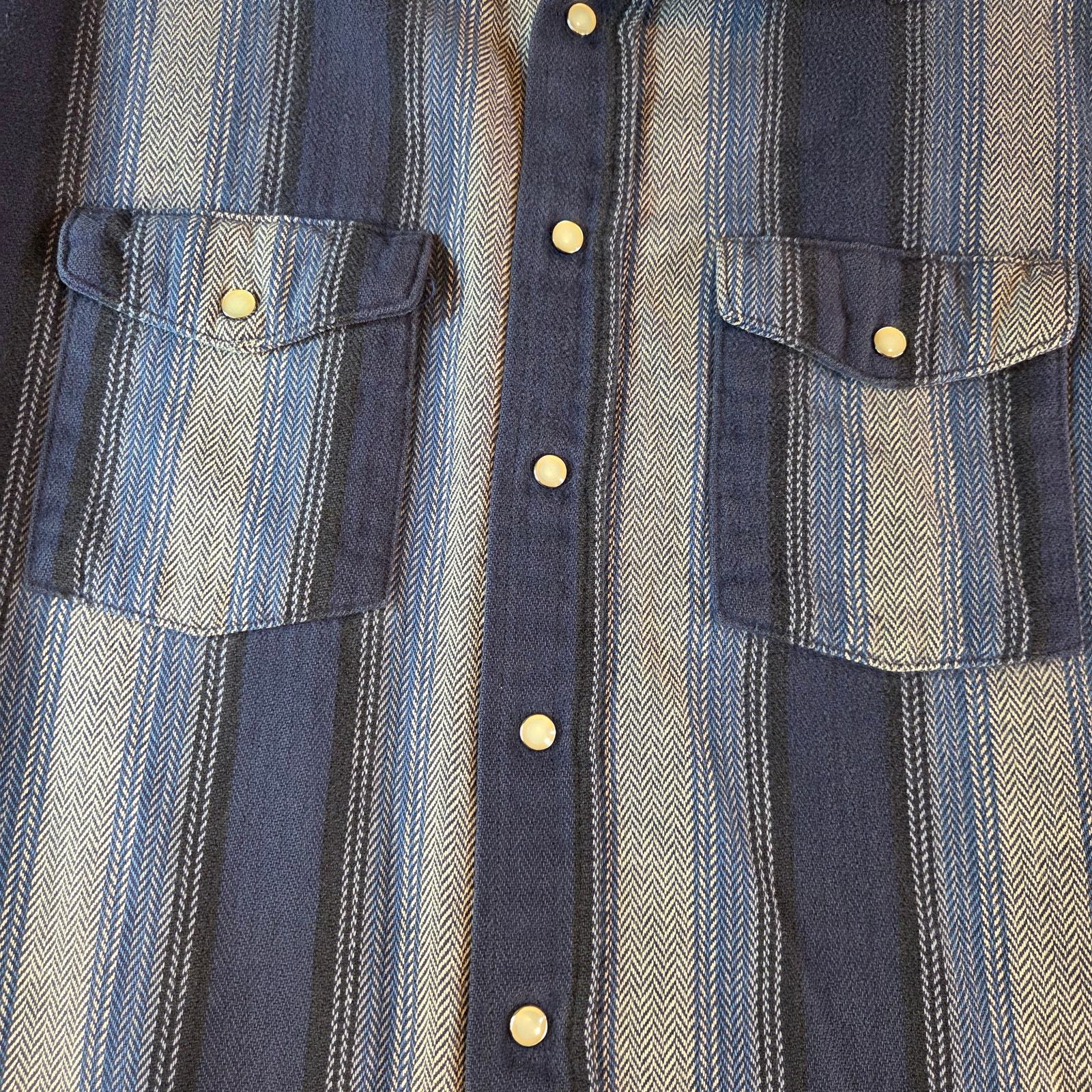 This Dakota Tallman men?s western shirt features a bold striped pattern in shades of blue with pearl snap buttons and double chest pockets. Made in a classic cowboy style, this shirt blends rugged charm with everyday wearability. Shows a couple of loose threads as pictured but still in solid wearable condition.