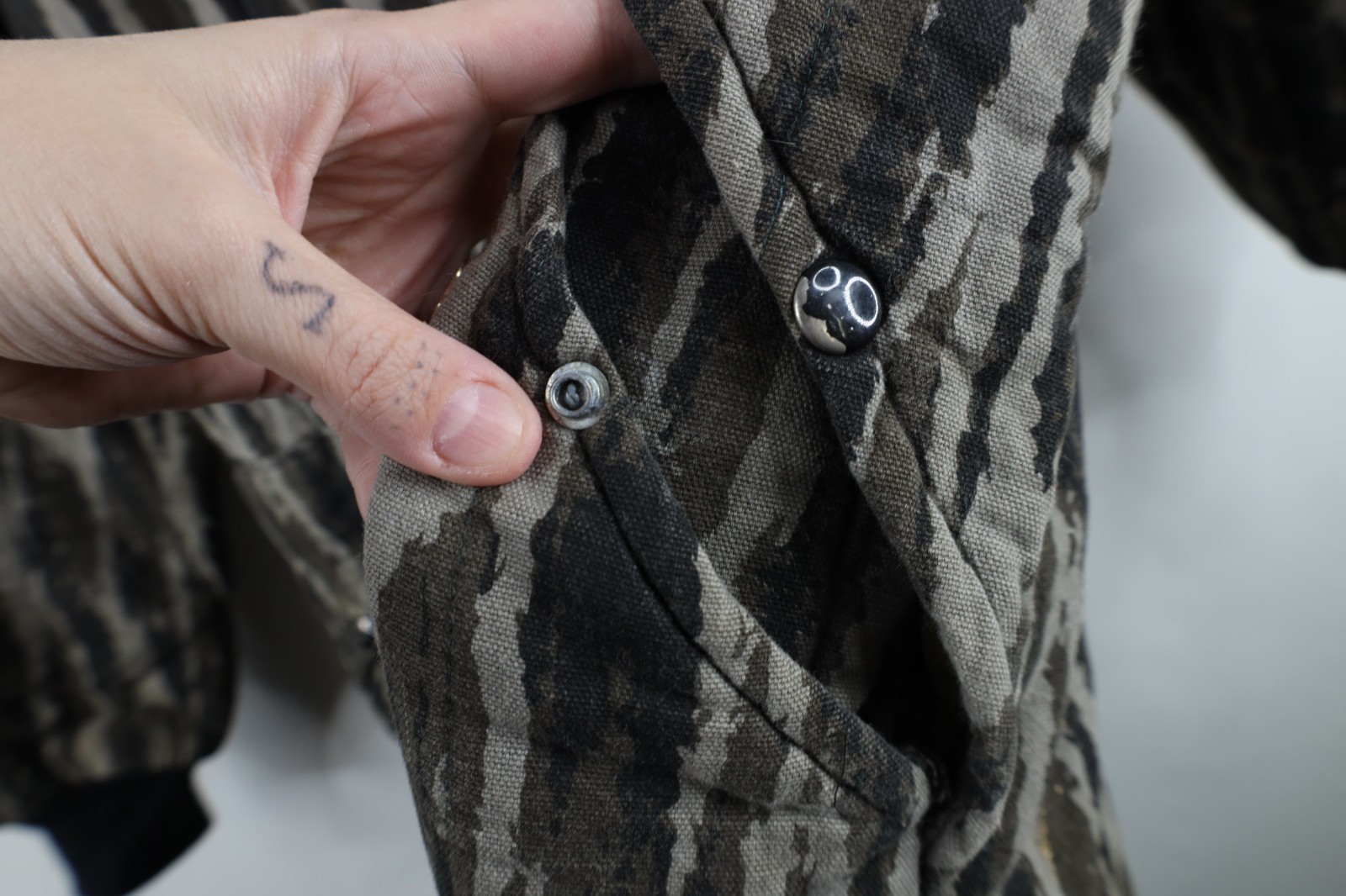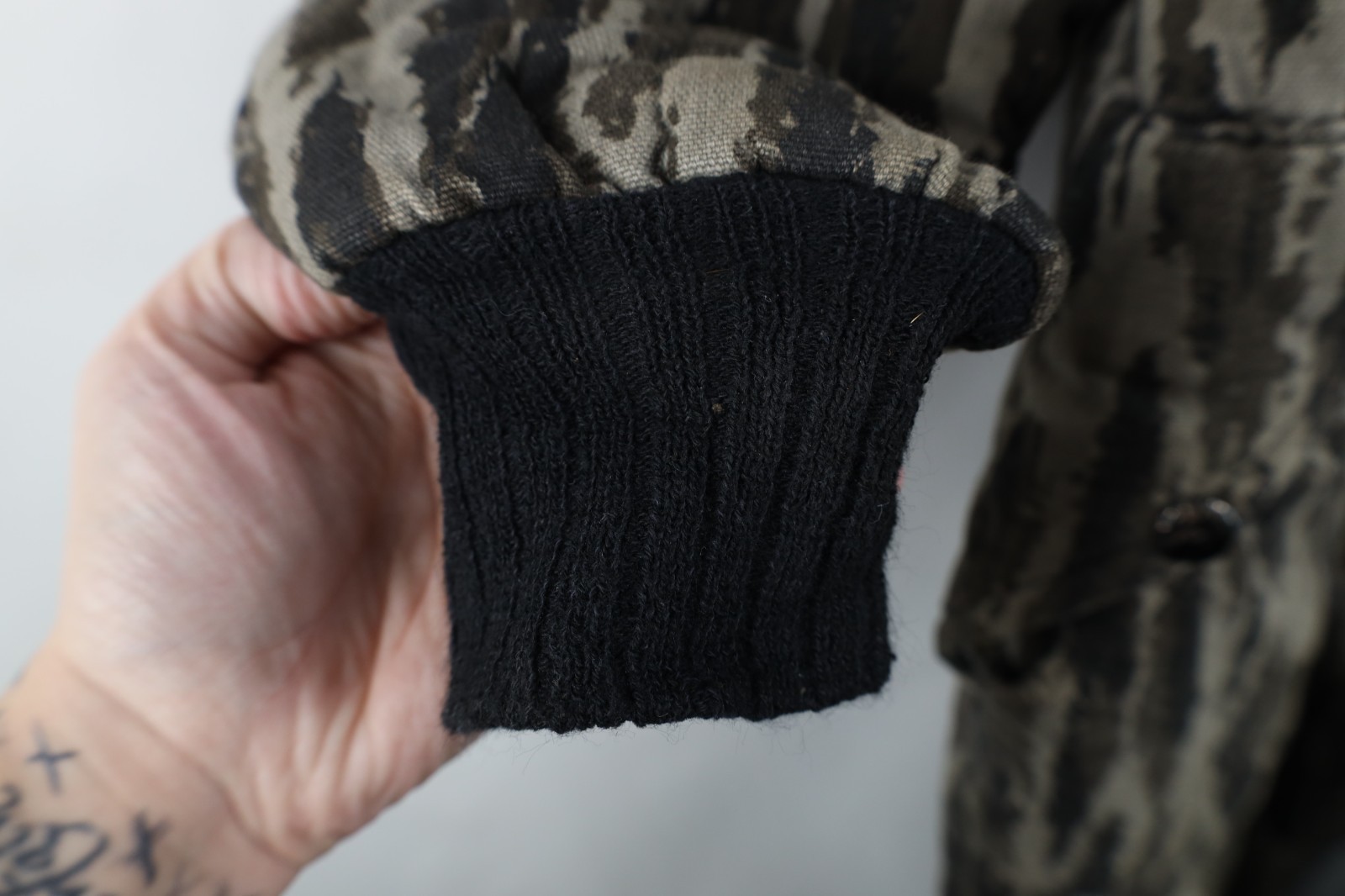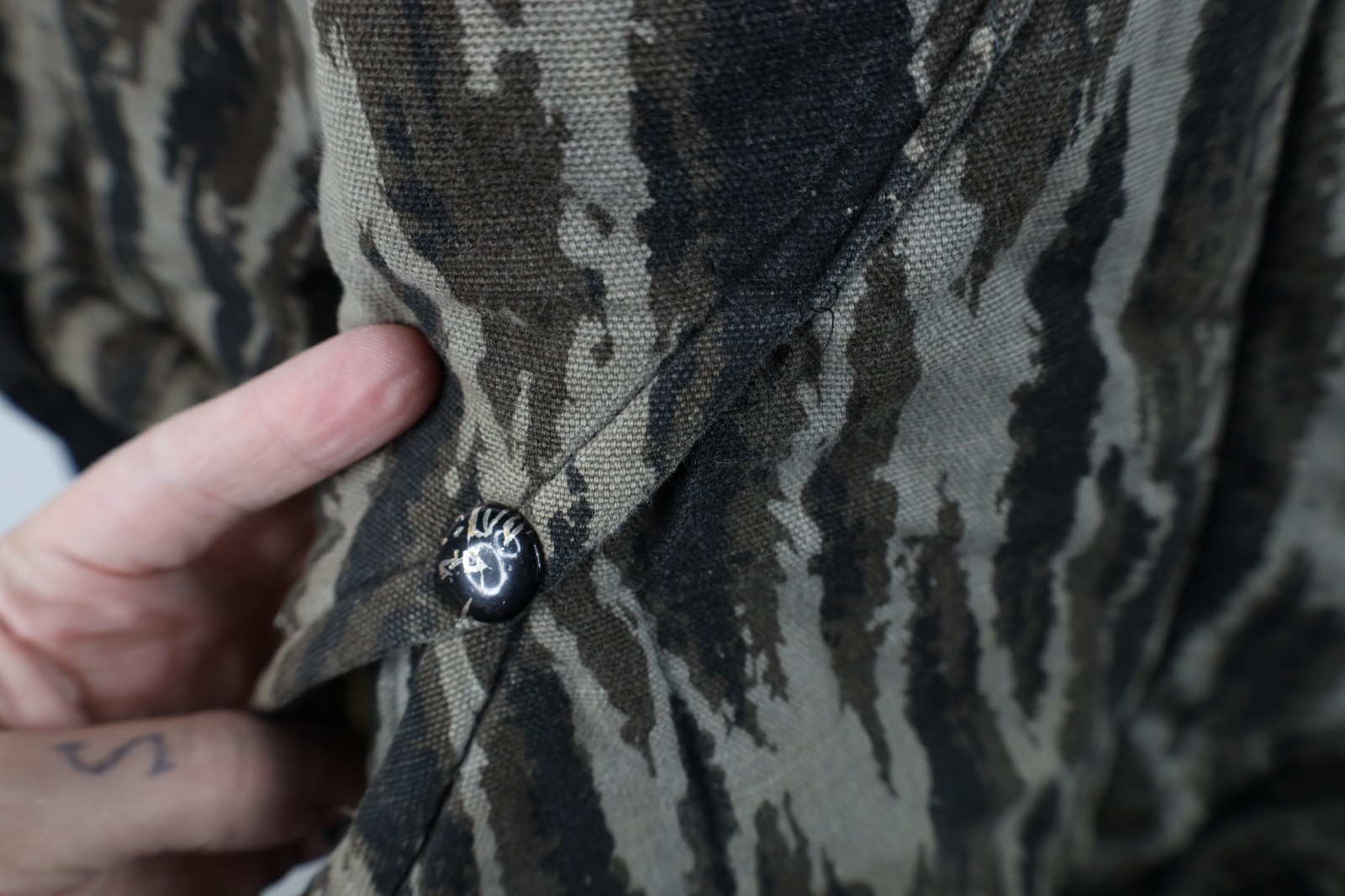 Blemishes front both legs, top pocket, back. Loose threads collar, pockets, inner lining, cuffs. Collar, cuffs, inner lining discolored. Thread bare spots, pilling. Color faded. Tag faded. Buttons tarnished. Made in USA