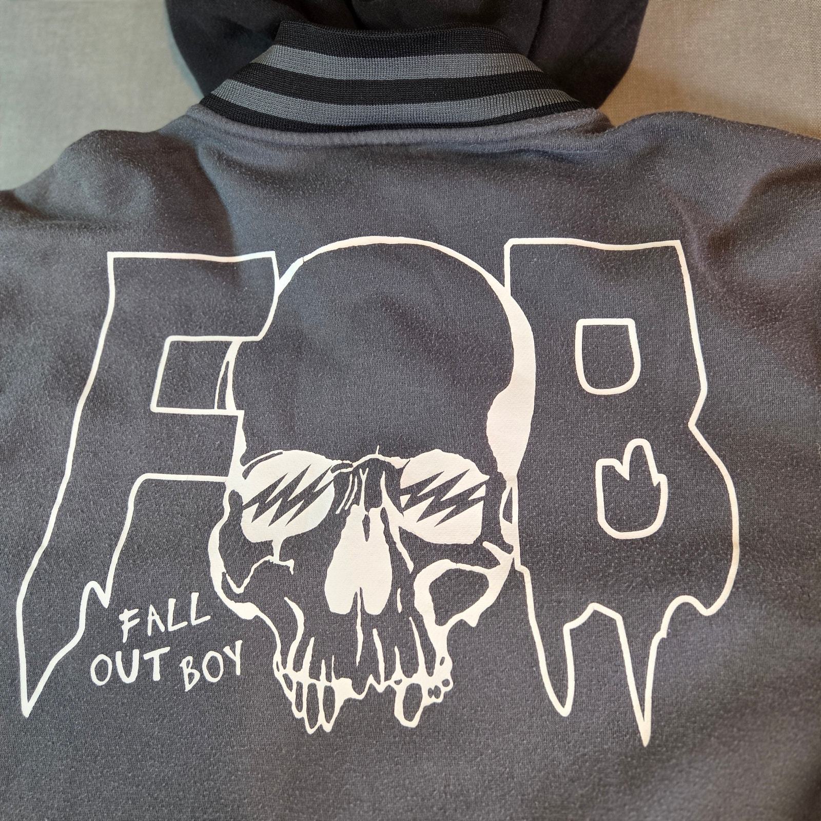 Show your fandom with this Fall Out Boy hooded varsity-style jacket by Manhead Merch. Designed in a gray and black colorway with striped cuffs and hem, this button-up jacket features a large FOB skull logo graphic on the back and smaller front branding. Constructed of a comfortable cotton/polyester blend, it has a built-in hood for casual layering. Excellent condition with no flaws noted ? ready to wear or collect.