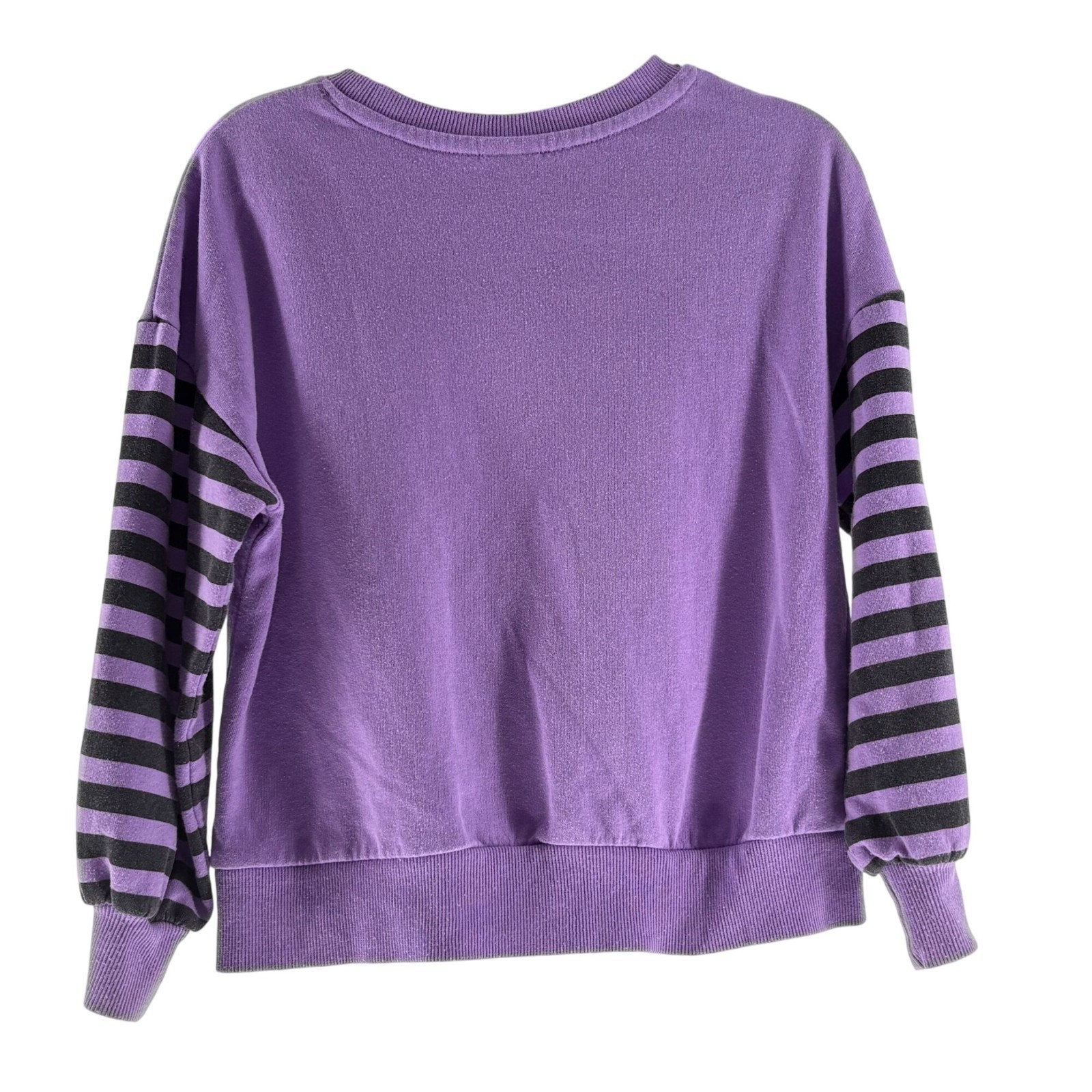 This purple sweatshirt features beloved characters from The Nightmare Before Christmas, offering a playful touch to your child's wardrobe. Made with a comfortable cotton-polyester blend, it's ideal for cooler weather. The striped sleeves add a fun element, while the ribbed cuffs ensure a snug fit.